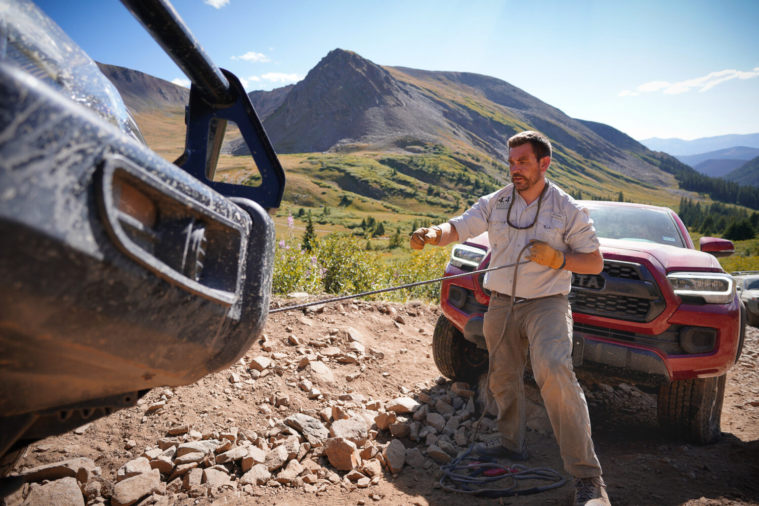 Jackson helping re-spool a winch after assisting one of the vehicles that had slid off the trail due to loose rock.