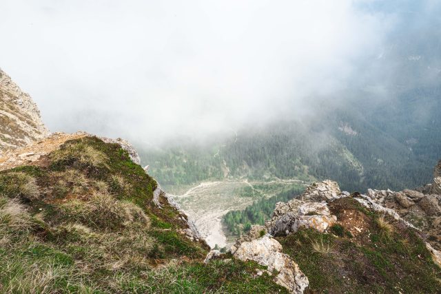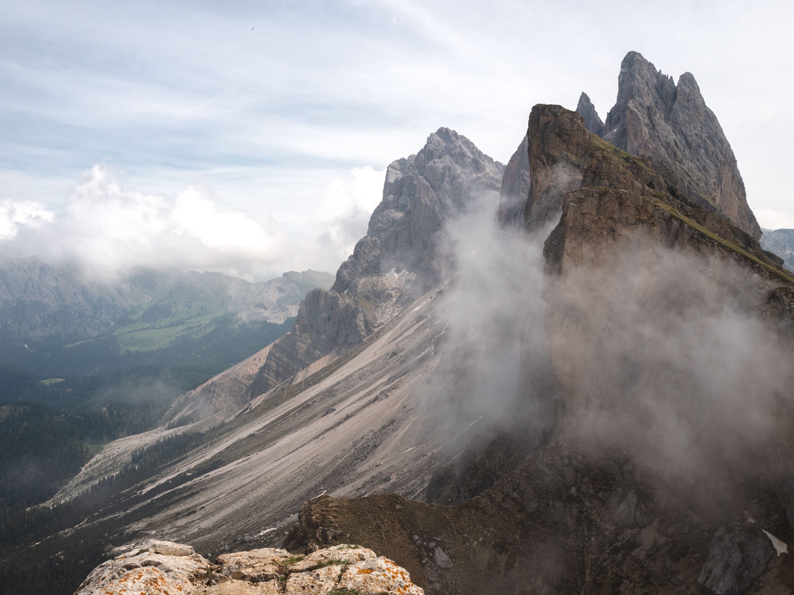 The journey to Seceda from Ortisei takes around 25 minutes (including the changeover halfway), and there’s a café, pizzeria, and public toilets at the top. The moment I stepped out of the cable car, I was met with a cold breeze and considerable temperature drop, so I’d recommend taking a warm layer. Once you exit the cable car station, you’re met with panoramic postcard-perfect views of the Dolomites and, of course, the imposing Seceda peaks. The ridgeline is at cloud level, and when I arrived, it was almost completely hidden from view, so I opted to sit in the café, which has a perfect vantage point.