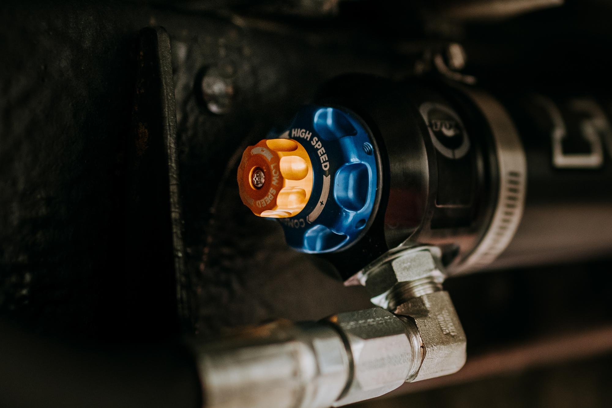 The Factory Race Series Fox shocks come with DSC (dual speed compression) adjusters. Contrary to what you may think, high and low speed doesn’t refer to the speed of the vehicle, but instead to the speed of the shock shaft. That means you can adjust compression for both high speed (fast washboard and small whoops) and low speed (ride, handling, and bottoming control) driving conditions. If the load in your vehicle is constantly changing, or you’re driving on ever-changing road conditions, you have the option to change your shock compression to compensate. There are 10 settings for low-speed compression (gold knob) and 12 for high-speed compression (blue knob).