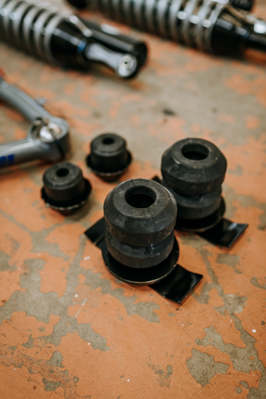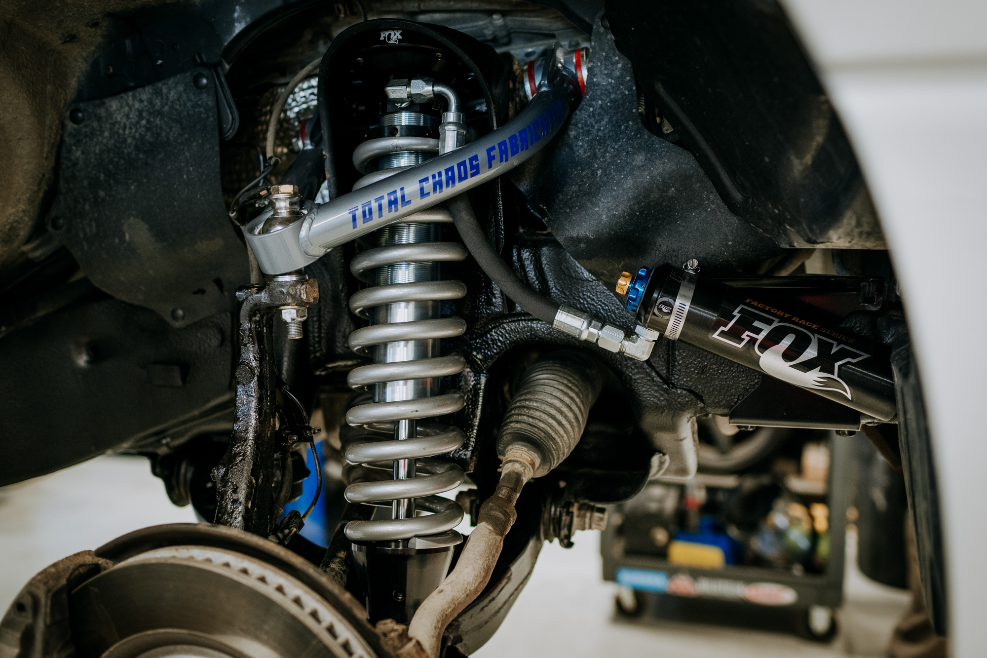 The Factory Race Series Fox shocks are the crown jewels that do all the work, but the Total Chaos upper control arms (UCAs) are what allow the additional wheel travel and alignment to stay within spec. With more wheel travel to play with, I’ll be pushing the limits (on purpose, or not), and that’s where the progressive spring rate of the Timbren bump stops come into play. These seemingly simple pieces of rubber work significantly better than the stock pieces.