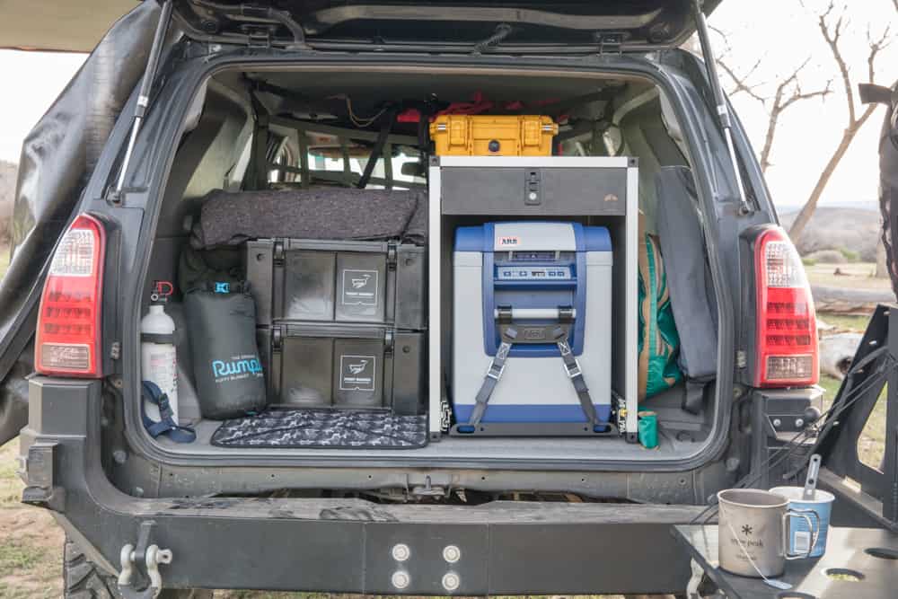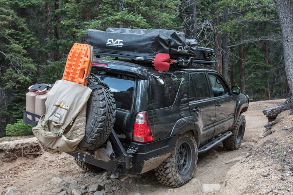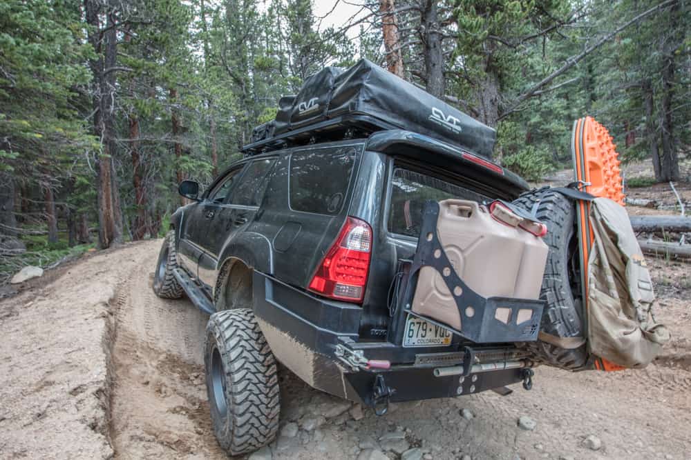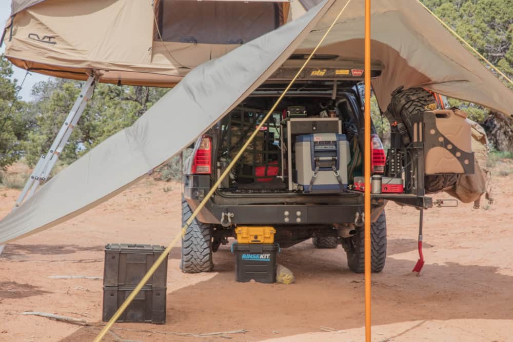 In the rear, he added a CBI bumper with dual jerry cans and a fold-out camp table. This augmented the 4Runner’s fuel supply, his water supply, and provided a place to prep meals near the rear of the vehicle. It also gave him a more appropriate mounting location for his spare tire.