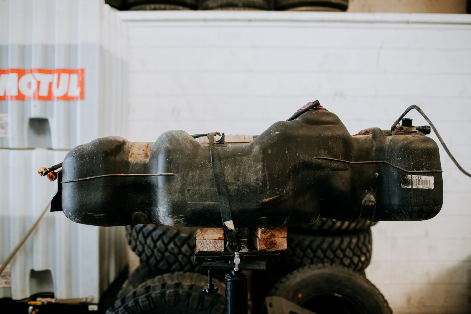 Our Tundra Double Cab weighs almost 6,000 pounds. With a 5.7-liter V8 gas engine turning 35-inch all terrains, it’s not surprising it has poor fuel economy. Combined with a small 26.4-gallon fuel tank, the range is about 500 kilometers. Fuel economy will only get worse as we add weight to the truck. Since we prefer not to carry additional jerry cans on the outside of the vehicle (the fewer bolt-ons, the better), we were on the hunt for a large-volume replacement tank.