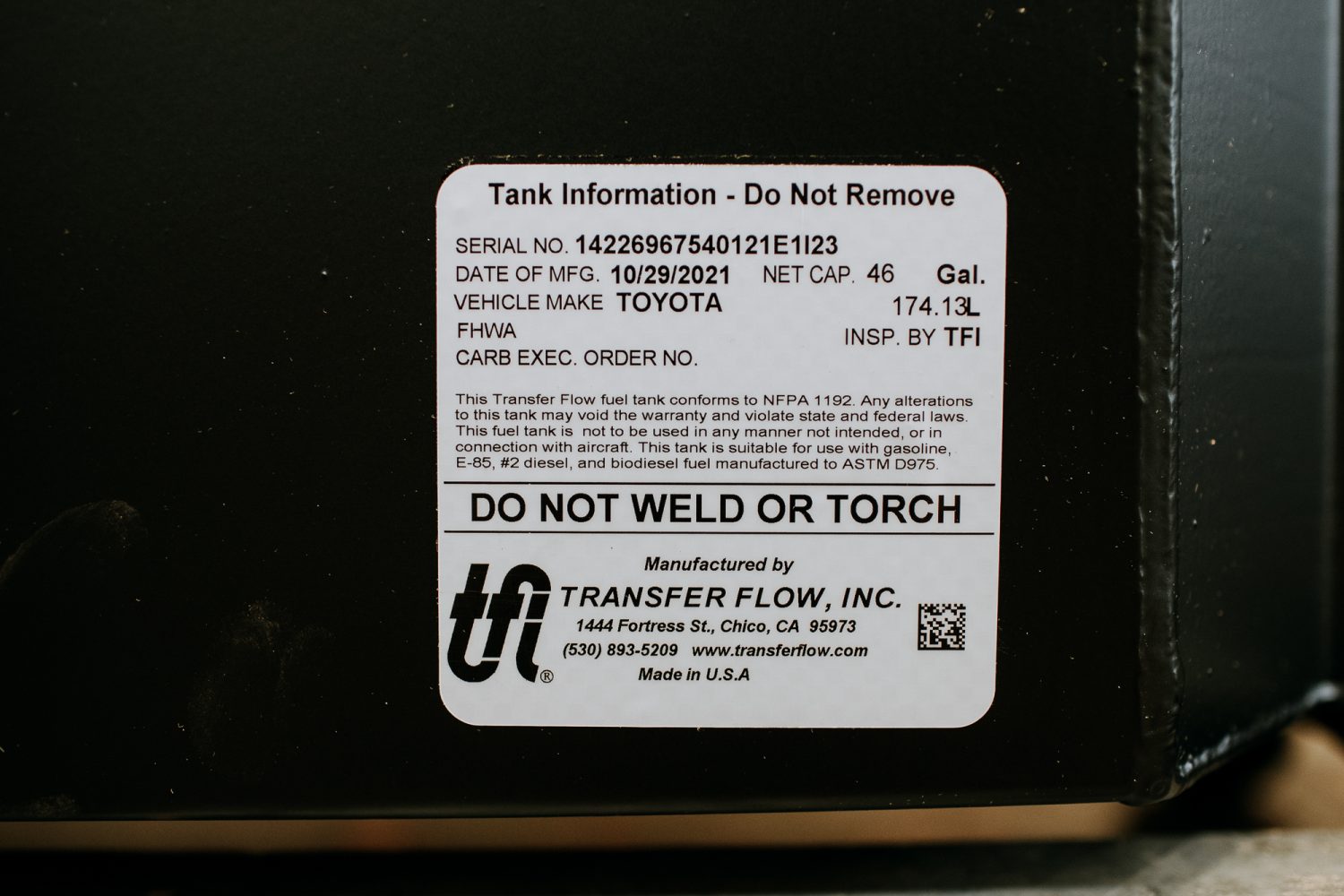 Eventually, we came across a Transfer Flow 46-gallon midship replacement tank (0800114225), and it was in stock! The high-capacity tank from Transfer Flow is made from 12-gauge aluminized steel, powder-coated satin black, and comes with all required mounting hardware. It sits high enough in the frame to eliminate the need for a skid plate and is backed by a six-year warranty. In the Tundra’s current configuration, the tank should increase our range to about 1,000 kilometers, eliminating the need for additional fuel cans. With greater range comes greater options. We’ll be able to drive a little farther on cheap fuel, bypass towns with expensive fuel, spend longer on meandering dirt roads, and avoid fuel that uses Coca-Cola as an additive.