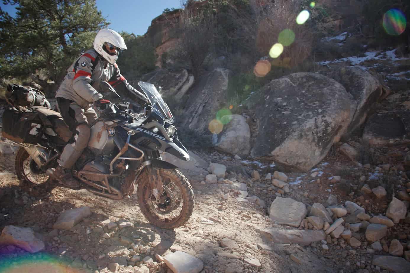 Sinuhe Xavier pilots the 2015 GS Adventure up a rock ledge in Canyonlands.