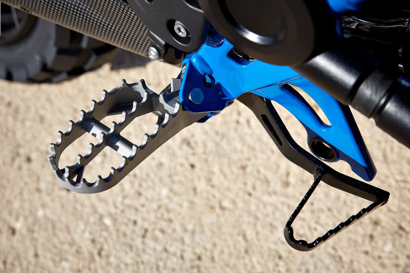 The off-road bias of the Rallye is strengthened with stiffer spring rates, longer spring struts and extra travel. Add to this, the flattened Rallye seat, giving you room to adjust body weight easily when off road, radiator and frame guards and on this particular bike, an optional Akrapovic exhaust.