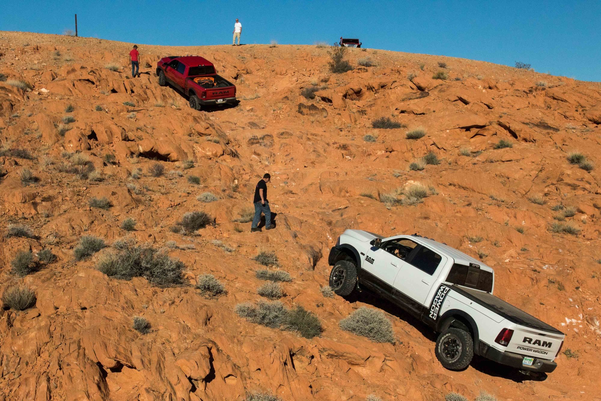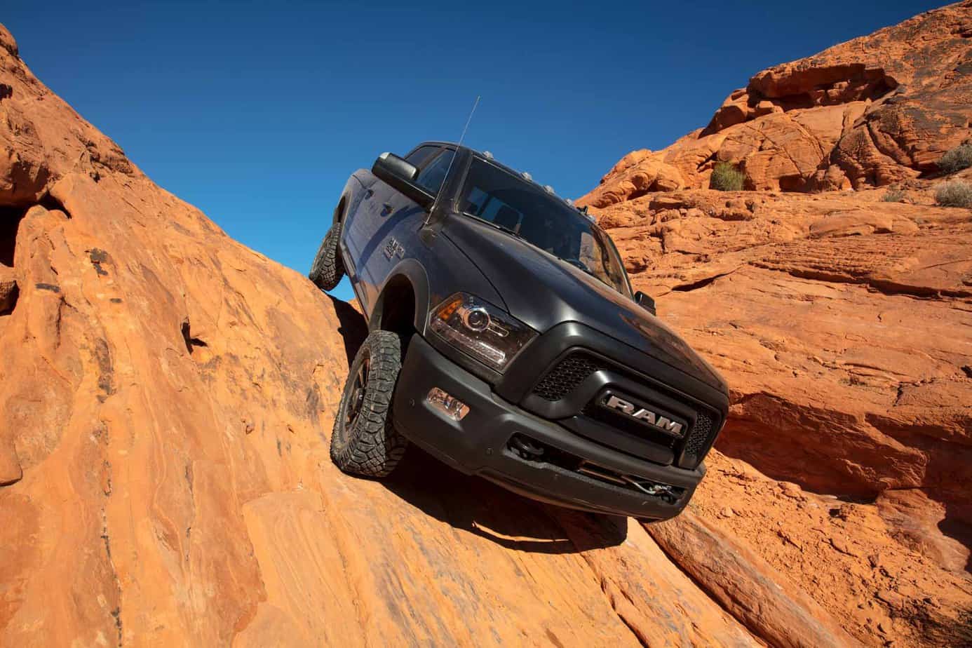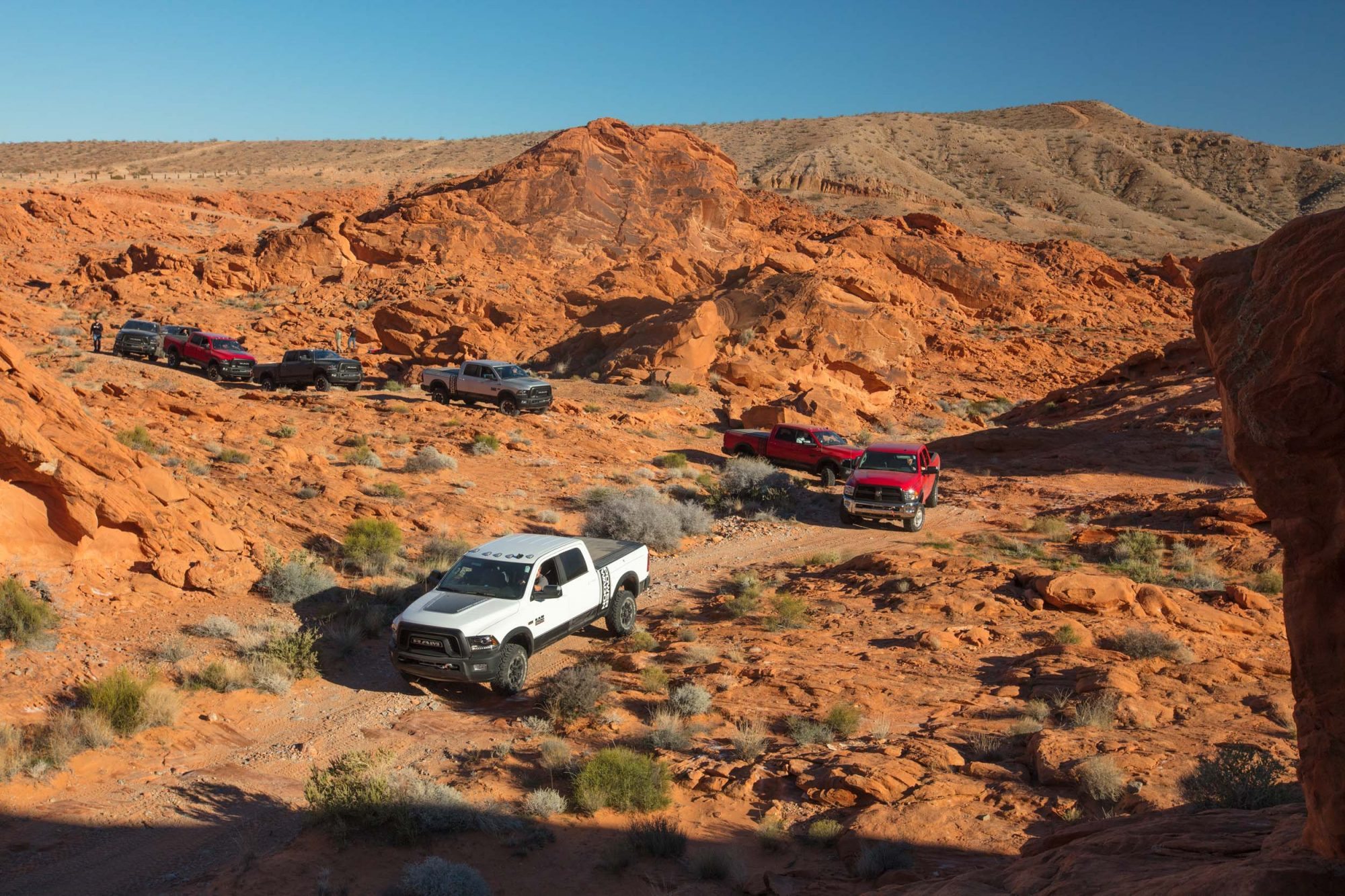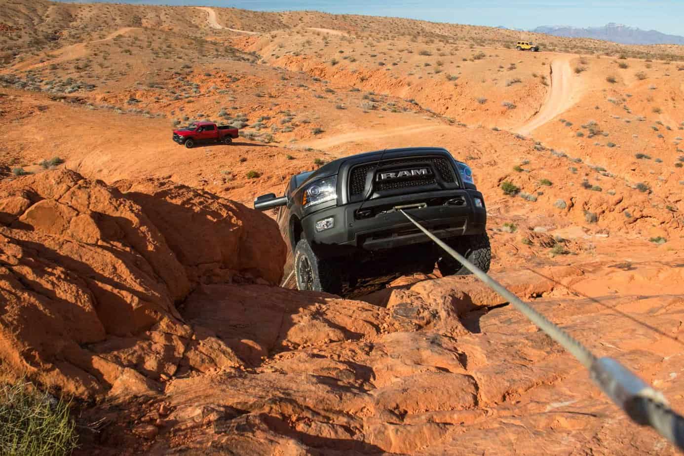 With a history dating back to 1945, the Power Wagon has long been respected as a heavy hauler, solid work truck, and up to just about any task at hand. What most people don’t know, however, is how capable the latest variant is on the trial. After towing an 8,950-pound Jeep/trailer through city streets and over mountain passes, which it did with ease, we pulled into the Moapa OHV area near Valley of Fire State Park. After disconnecting the trailer and offloading its cargo (2016 Jeep Wrangler JK), we aired the Ram’s 33-inch Goodyear DuraTrac tires down to 30 psi and shifted the transfer case lever into four-wheel drive (no push-buttons here). The Moapa area is reminiscent of Moab, Utah, and offers a plethora of terrain options: sand dunes, high-speed two-tracks, and technical rock crawling.