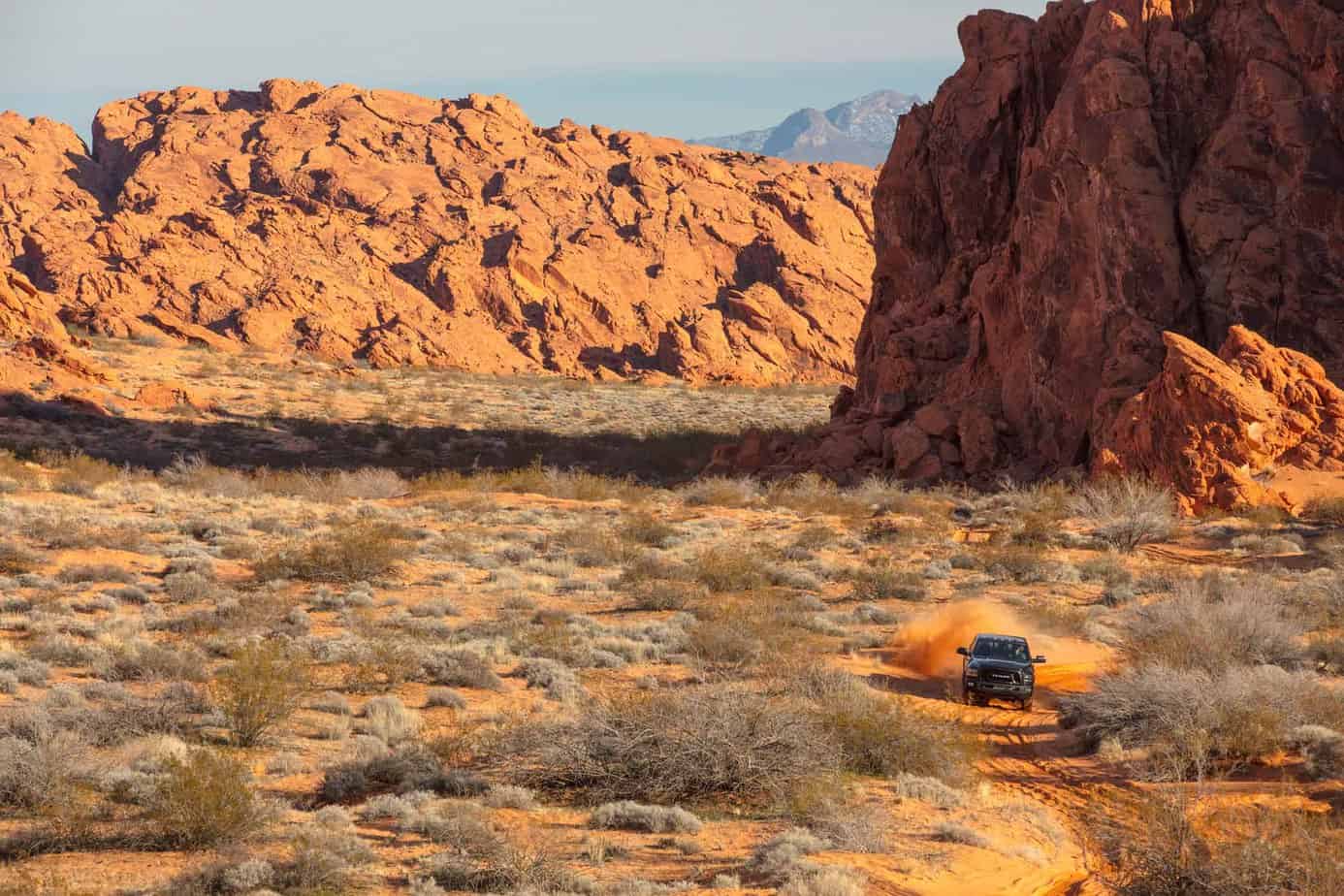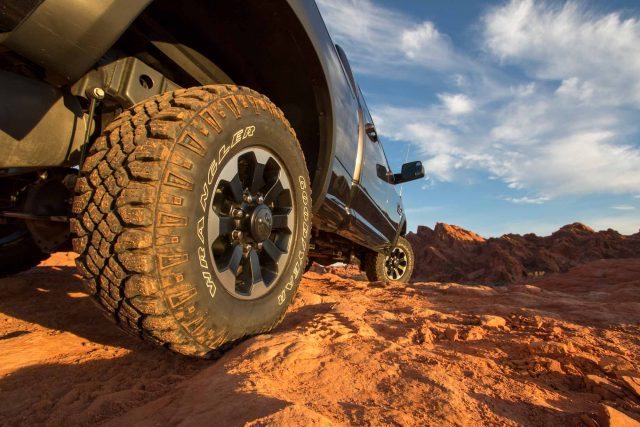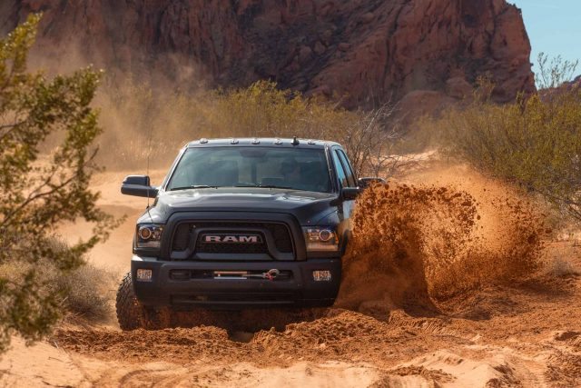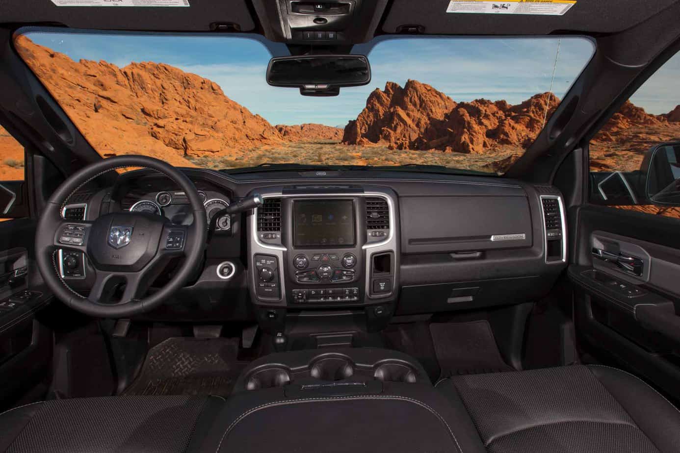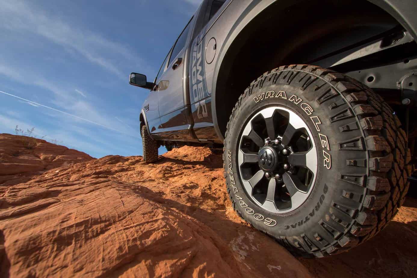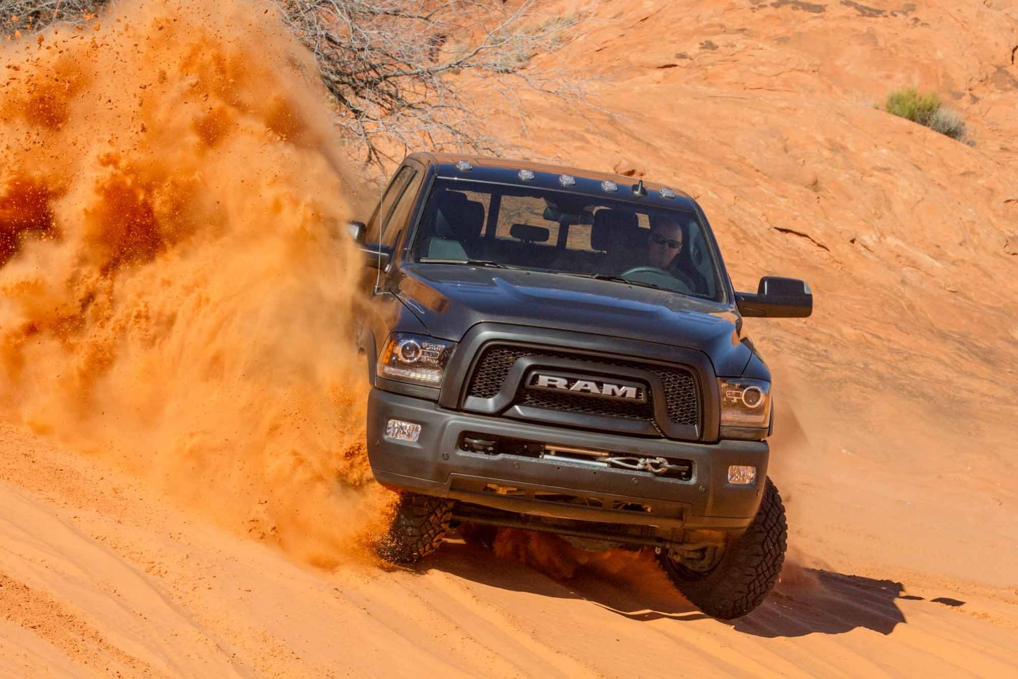 With a history dating back to 1945, the Power Wagon has long been respected as a heavy hauler, solid work truck, and up to just about any task at hand. What most people don’t know, however, is how capable the latest variant is on the trial. After towing an 8,950-pound Jeep/trailer through city streets and over mountain passes, which it did with ease, we pulled into the Moapa OHV area near Valley of Fire State Park. After disconnecting the trailer and offloading its cargo (2016 Jeep Wrangler JK), we aired the Ram’s 33-inch Goodyear DuraTrac tires down to 30 psi and shifted the transfer case lever into four-wheel drive (no push-buttons here). The Moapa area is reminiscent of Moab, Utah, and offers a plethora of terrain options: sand dunes, high-speed two-tracks, and technical rock crawling.