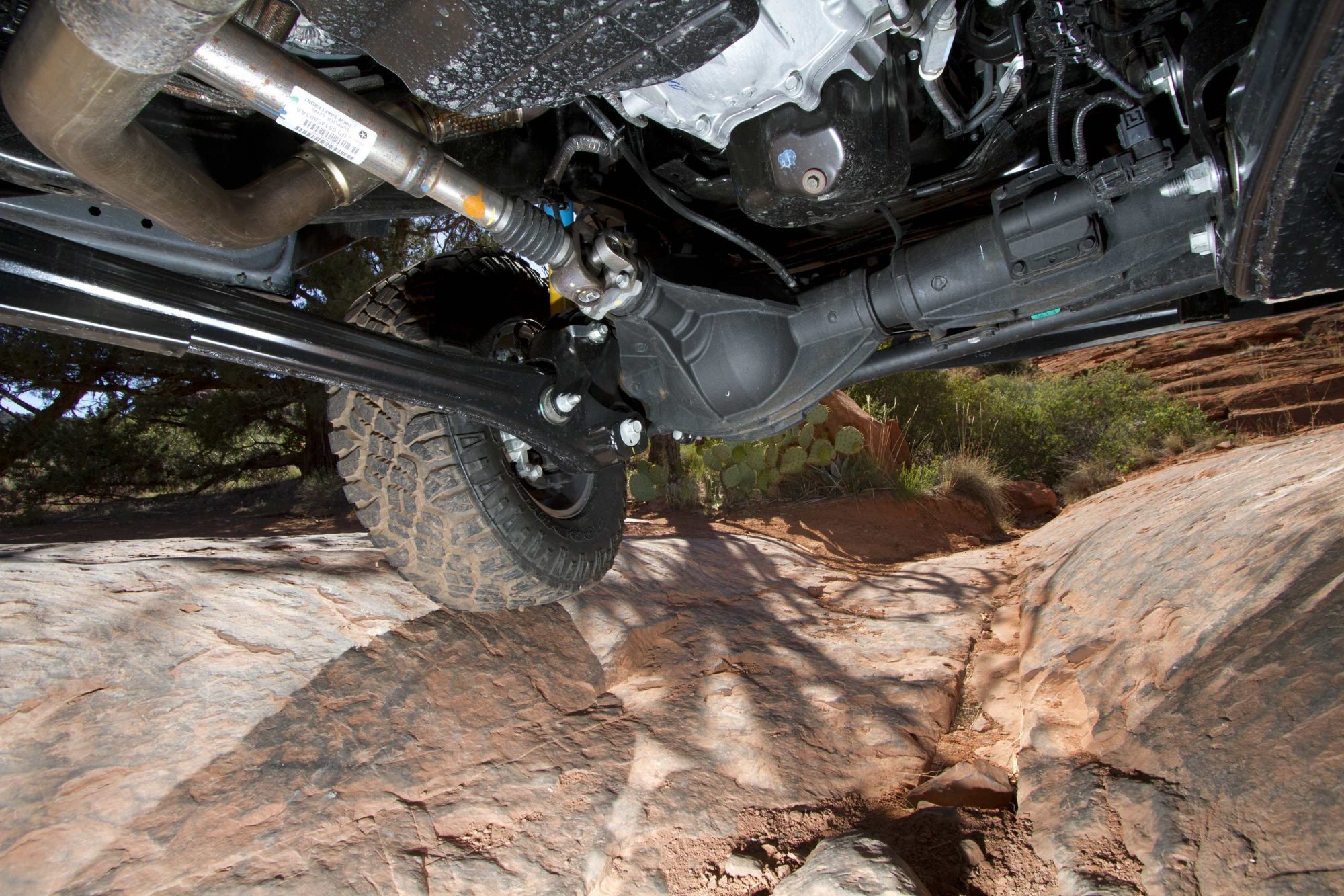 Something oft overlooked in a full-size truck is versatility—the ability to transition from being a rigid heavy hauler to flexible trail tamer. Although the Power Wagon’s 6.4-liter HEMI V-8 generates 410 horsepower and 429 lb-ft torque, enough to propel the truck over moderately sized dunes with ease, technical terrain requires the ability to keep all tires on terra firma and turning in unison. Its coil spring suspension consists of Ram’s Articulink front and a five-link rear configuration, and activating the electronically controlled sway bar disconnect allows the driver to take full advantage of 26 inches of available wheel travel. If a tire does lift, engaging the front and rear locking differentials, actuated by easy-to-reach buttons on the dash, will ensure steady progress. At each corner, Bilstein gas shocks, tuned specifically for the vehicle’s size and weight, manage damping. The suspension combination raises the vehicle about 2.5 inches over the standard Ram 2500, for a respectable 14.2 inches of running ground clearance (8.3 at the differentials).