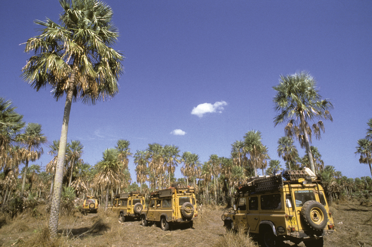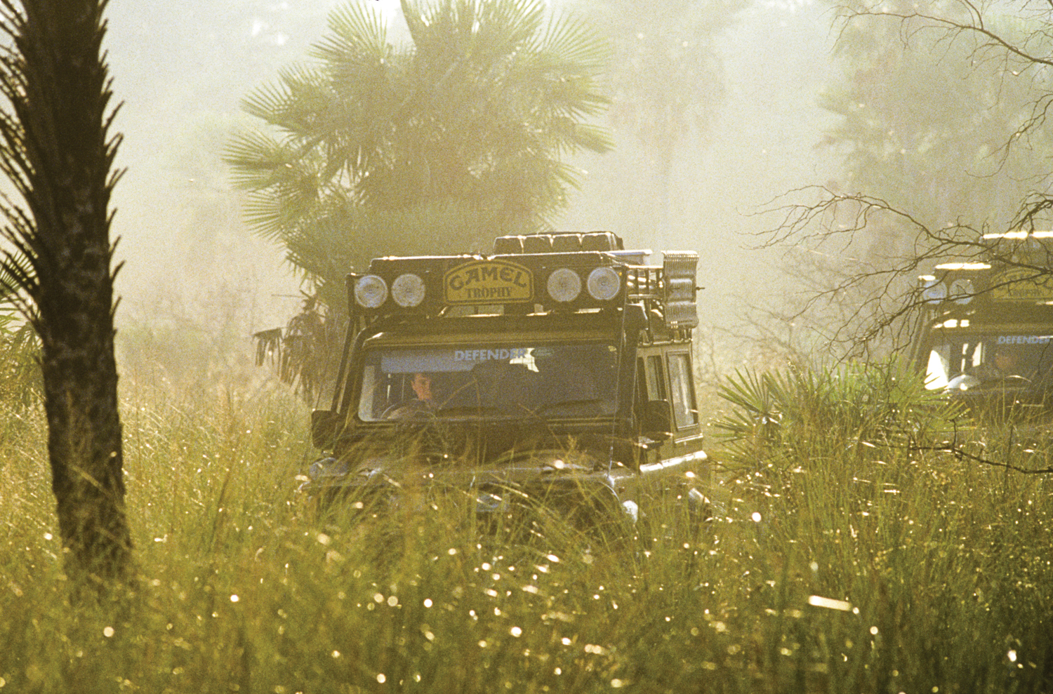 We soon reached the crossroads and said goodbye to our Paraguayan friends. Everyone was sad to see them go, but we had no time to think about anything except the Road to Hell. Fortunately for us, drought had boiled the water away and all that was left was a faint sandy track through a forest of scrub, palm trees, and huge hummocks of grass. The route was very difficult to follow, marked only by occasional blazes on the trees. The grass hummocks gave us a lot of trouble. We did not have the ground clearance that an ox cart has and constantly got hung up on the unforgiving mounds of grass. The Camel Trophy vehicles have a large aluminum skid plate to protect the steering rods, and this plate was put to work as we bashed hummock after hummock in what looked like a mad dash through the forest. We employed snatch straps and winches to keep the convoy moving forward every time one of us failed to smash up and over a tough ball of grass and sand. After many miles, the forest opened up and we were able to make better time, resorting to the winches only when a driver did not use enough momentum to climb the sandy banks of the many small creeks that coursed through the area. We had just driven through Hell and it worked us. Everyone wondered what it would be like when covered with water. Many of us would find out next year.