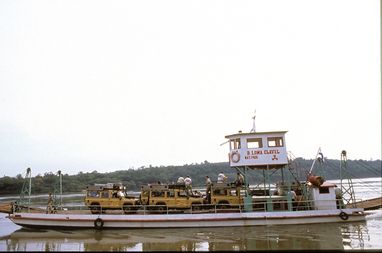 We camped in the town park and arose well before dawn to start our exploration of Paraguay. The ferry from Eldorado to Puerto Mayor Otaño, Paraguay, was out of commission, so we had to find another ferry to cross the river. But none of the locals knew of any running ferries within a hundred miles. We headed south along the river road looking for any boat that could get our convoy into Paraguay. At the tiny town of Puerto Triunfo we found a rough barge that was ferrying cattle from Argentina into Paraguay. Steve Silk made a deal with the gauchos and they hauled our Land Rovers across the Paraná River two at a time.
