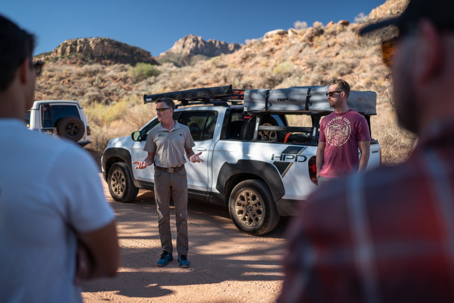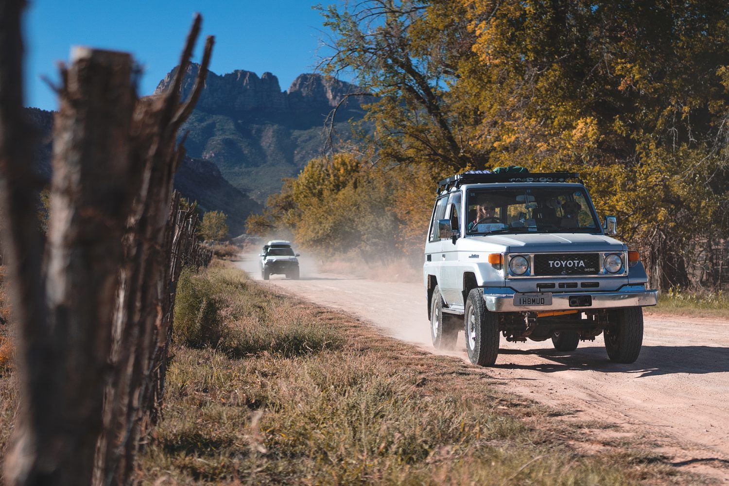 Walking away from the buildings, our group’s focus shifts back to the convoy of a dozen overland vehicles parked along the sandy road in the shade of the fluttering cottonwood leaves. Whereas the pioneers of this valley relied on their horses, we rely on horsepower. Our vehicles, unusual as they may appear to the average motorist, are purpose-designed for off-highway travel. Each has a variety of extra bits (overland equipment) bolted to roof racks and tailgates. Rooftop tents, Hi-Lift jacks, jerry cans, sun awnings, and shovels fulfill a variety of purposes, from providing comfort in camp to helping us recover vehicles if they become stuck or disabled on the trail.