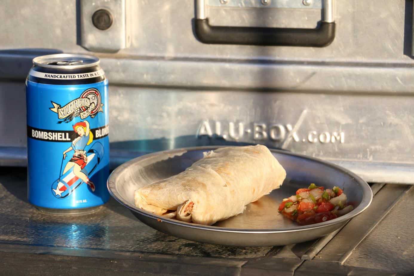 As the sun dropped, the colors finally began to come out in the dry landscape. We made camp near some lush fields and began cooking our dinner: carnitas and pico de gallo with a Texas beer.