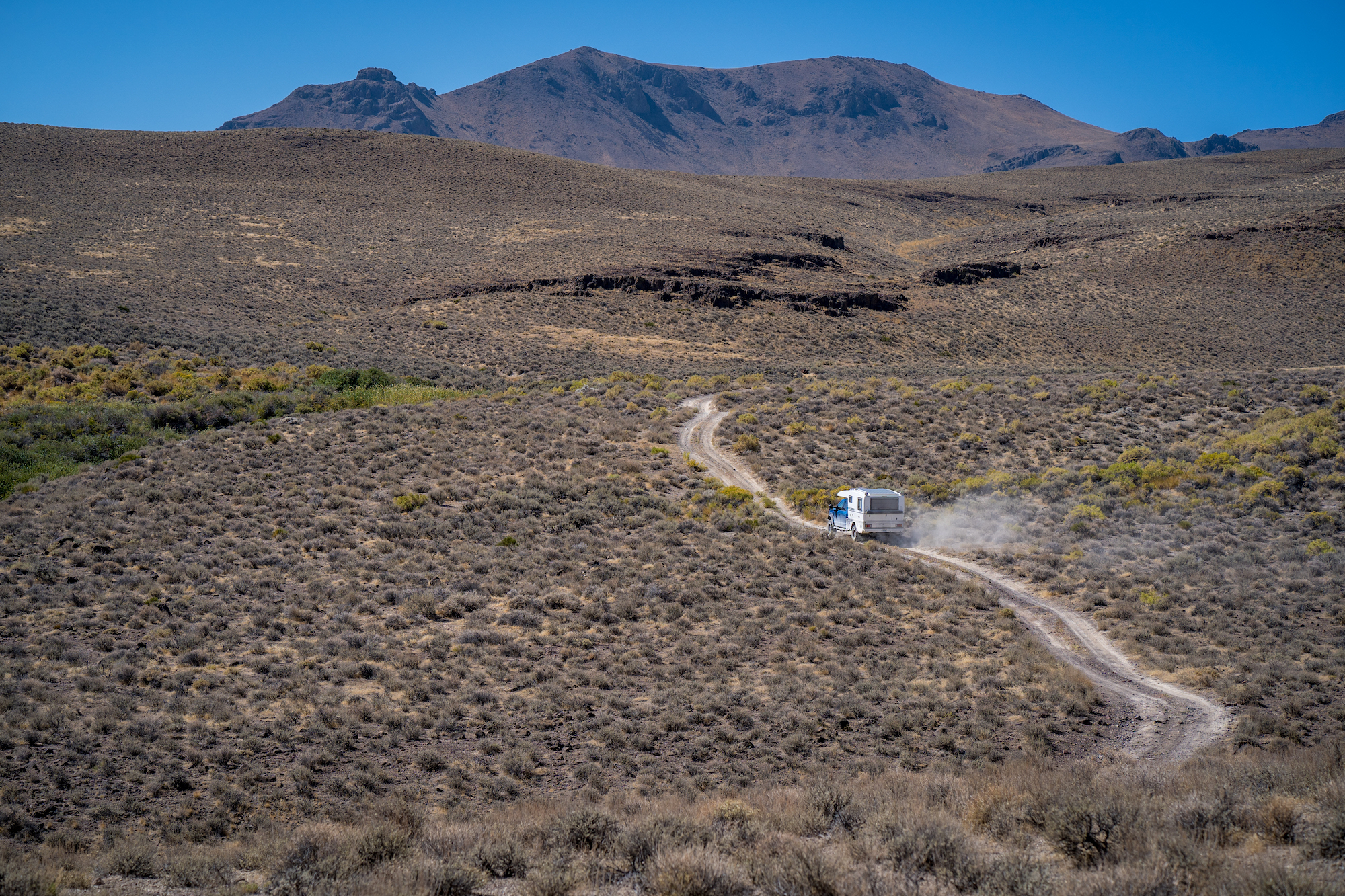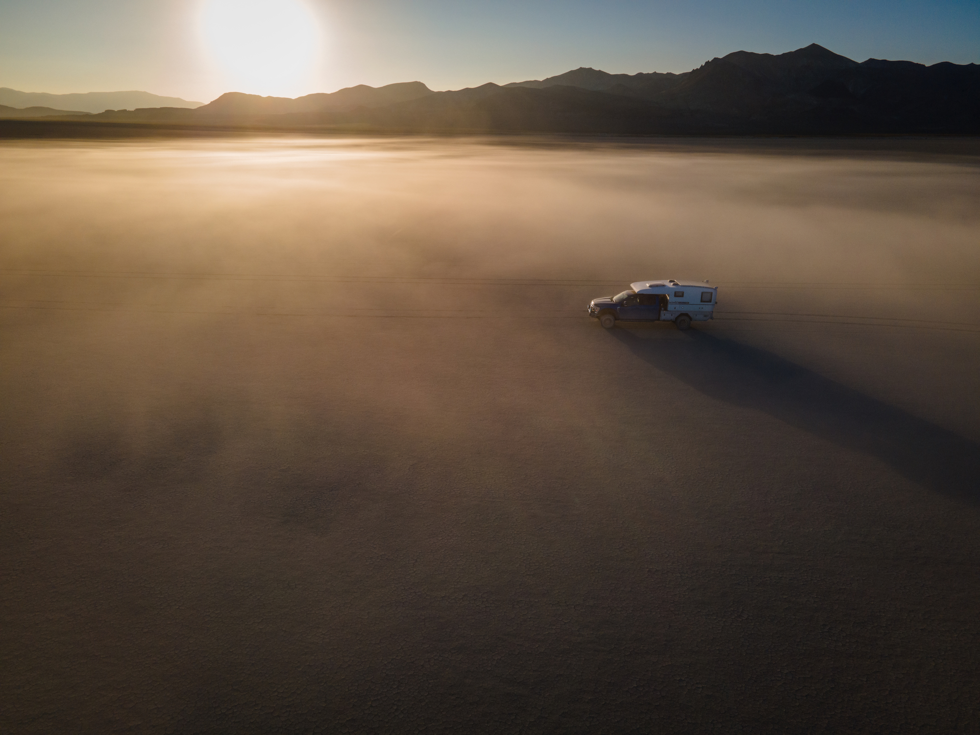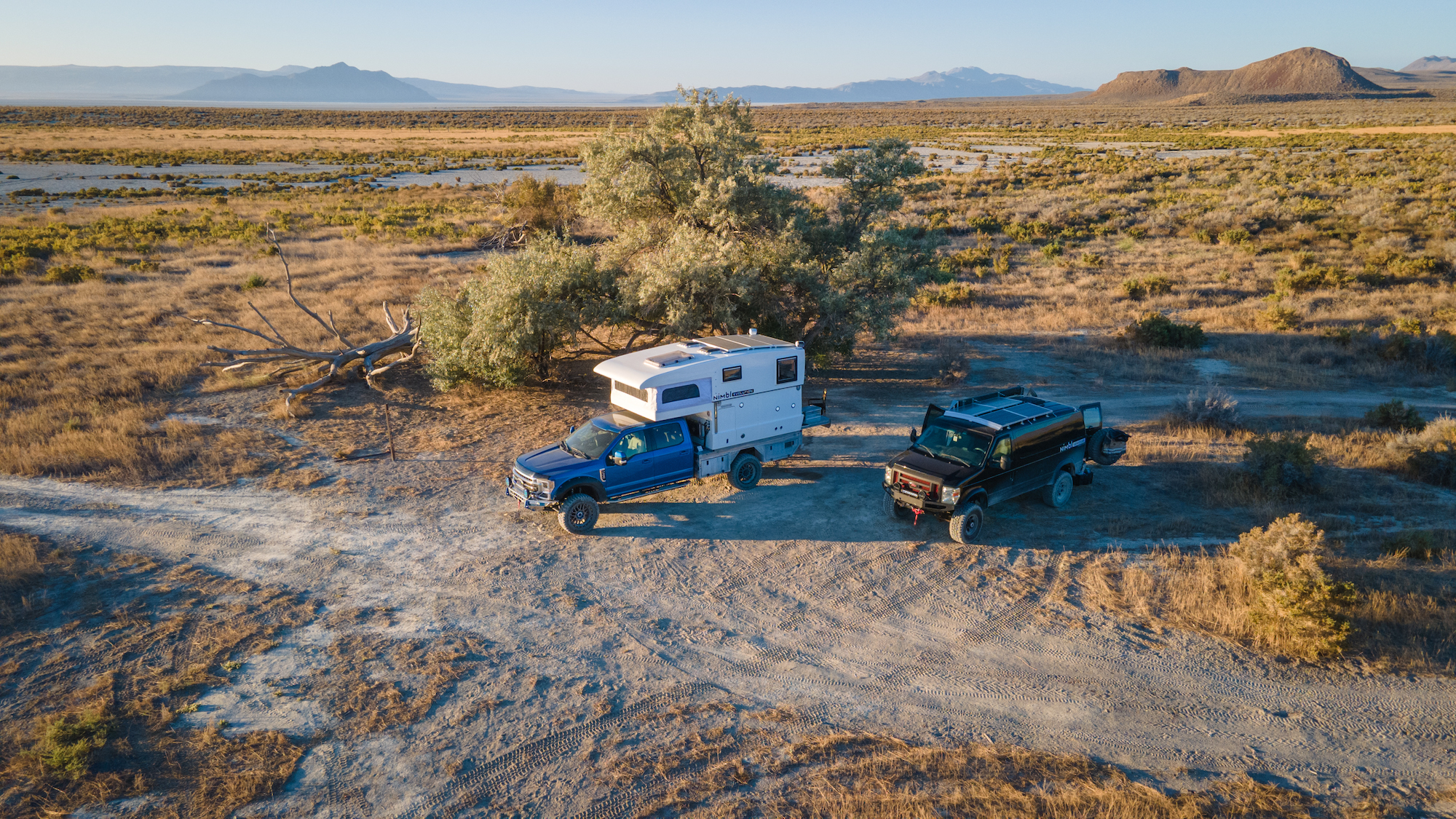 Completing our track over the mountain gave a memorable tour of the higher-elevation terrain, a stark contrast to the playa below. But the playa was calling, with one of our goals being to make camp on the massive dry lake bed. We drove out onto the hardened crust and set our own version of an overland camper land speed record (we don’t speed and tell). The truck was filled with laughter as the plume of dust filled the mirrors, and we closed in on our chosen spot for the night.