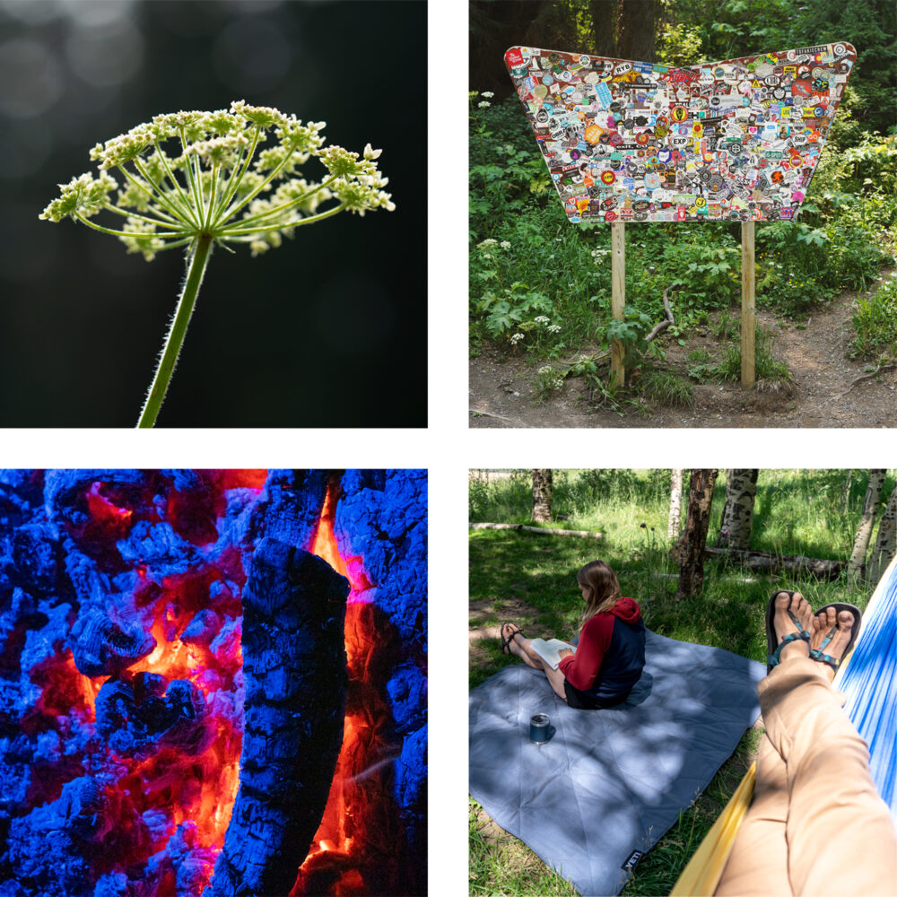 Clockwise from top left: Cow Parsnip, the Scofield Pass summit, relaxing under Populus Tremuloides (Quaking Aspen), and the glowing coals of our campfire.