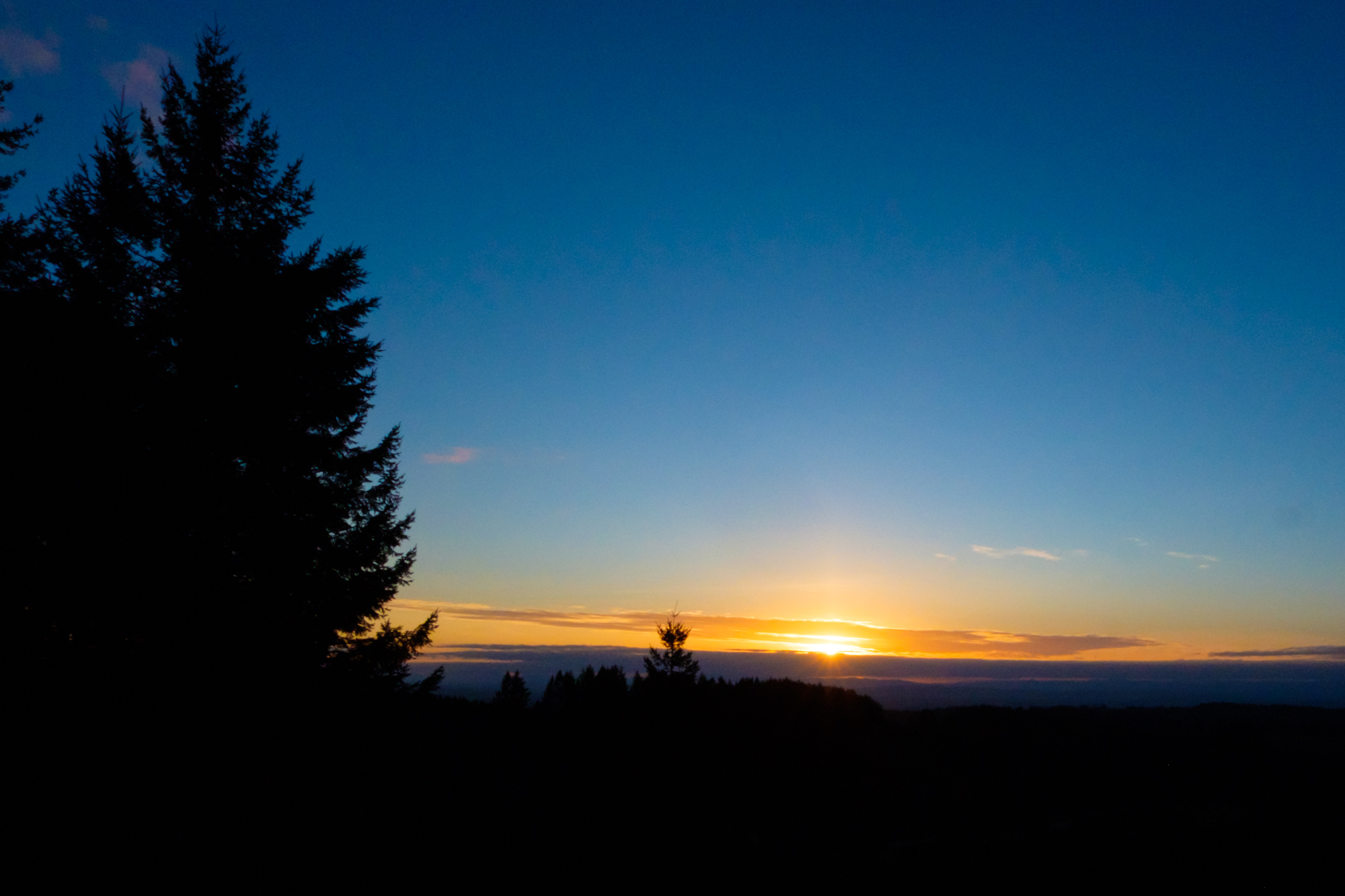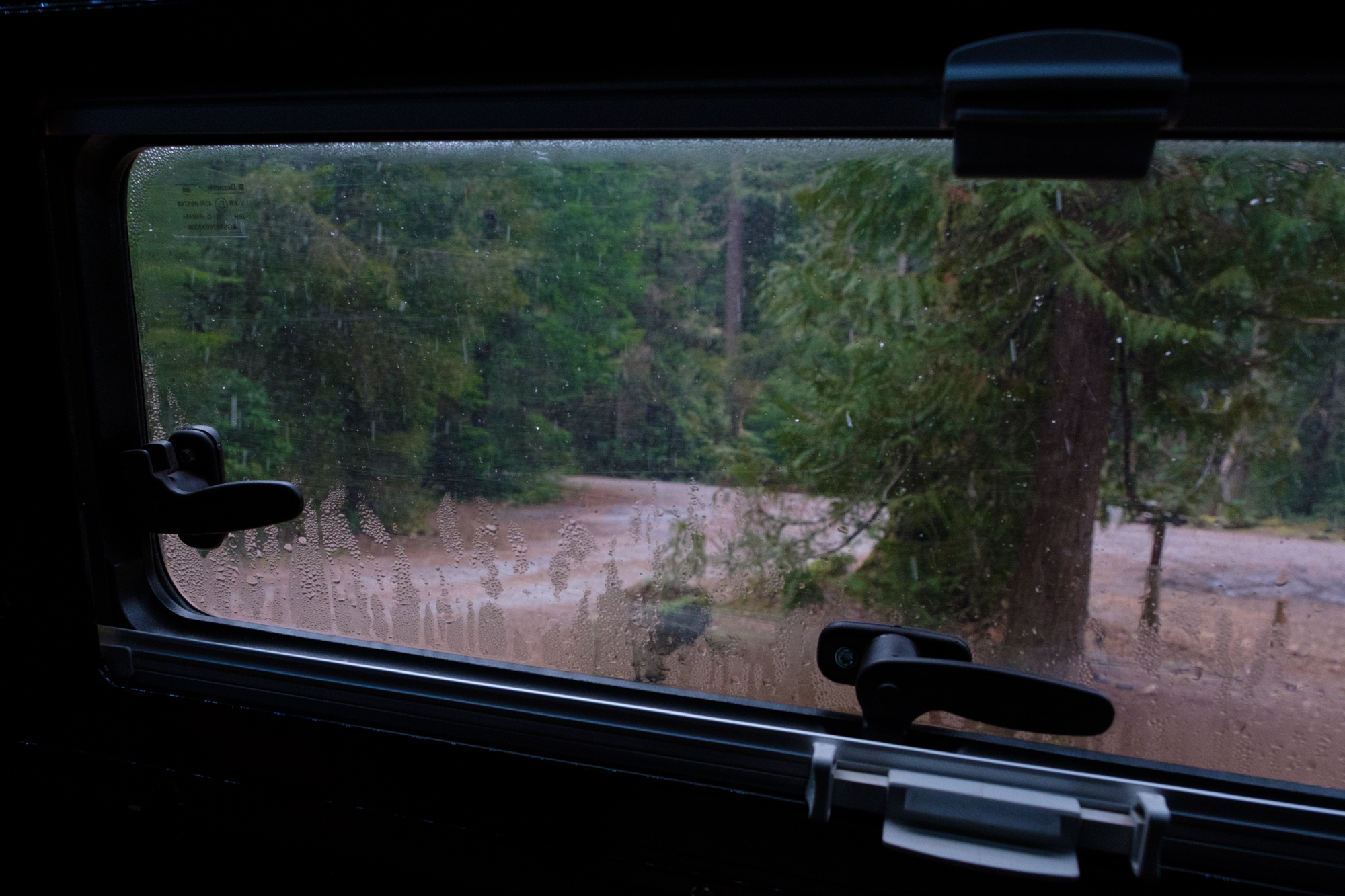 My alarm blared, and slapped at it in a futile attempt to make it stop. Where was the blasted thing!? A crisp clunk sounded on the floor down below. Crap. I peered down from the bed at the lower level of the camper, where my iPhone was happily berating me with an alarm to get out of bed. I slipped down from the top bunk and silenced the device. When I looked up, my heart jumped into my throat—through the window, I could see snow falling all around us. The camper’s heater had been running, which had made me forget that outside the temperatures were dropping rapidly. I woke my girlfriend, who sipped coffee with me while watching the wisps of wind blowing the flakes through the trees. I wondered if the higher elevations had received more snow. If so, it would make our planned day toward Mount Hood a challenge.