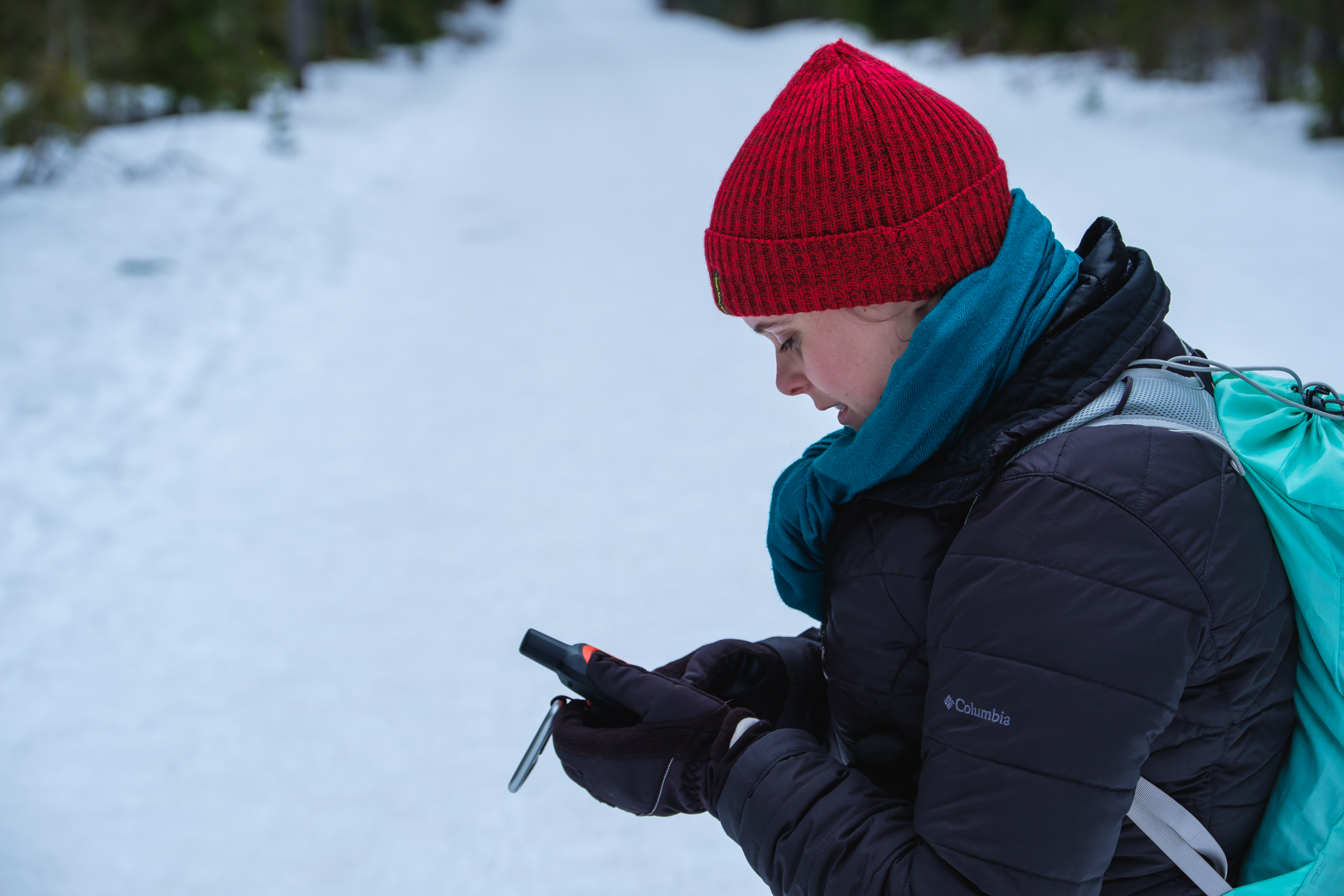 It was well into the afternoon by the time we rolled into the parking lot, but it appeared our luck was improving since there was still snow covering this trail. We opened up the rear compartment in the Maltec to grab our necessary gear: snowshoes, winter boots, trekking poles, water, backpacks, and, of course, snacks. I also strapped our inReach to my backpack in case anything were to go wrong on our very brief hike. Better safe than sorry, right?