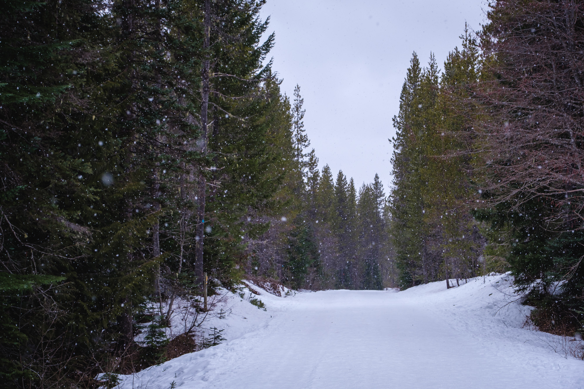 Off the road, the snow was much deeper and more powdery. It made softer sounds than the ice had as we trudged through it, allowing us to enjoy the peaceful hillside dropping toward the valley below. Here and there we would spot animal tracks, and overhead a light snow began to fall. We pushed on, further down the hill, while the flakes became larger and more regular. We took a break, and decided to check the inReach’s weather forecast for our location. The snow was supposed to get heavier, and darkness was approaching once more. There wasn’t far to go in order to reach the lake, but with my recent injuries, it wasn’t worth the risk. We decided to turn back.