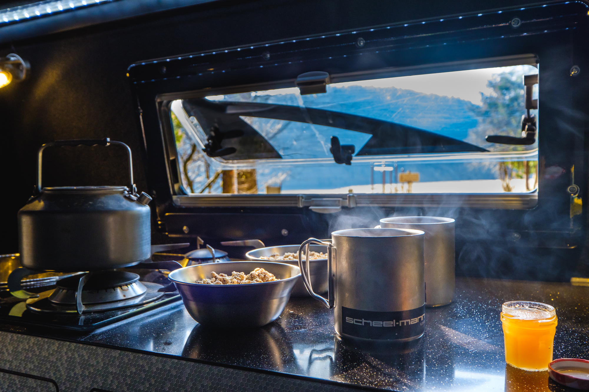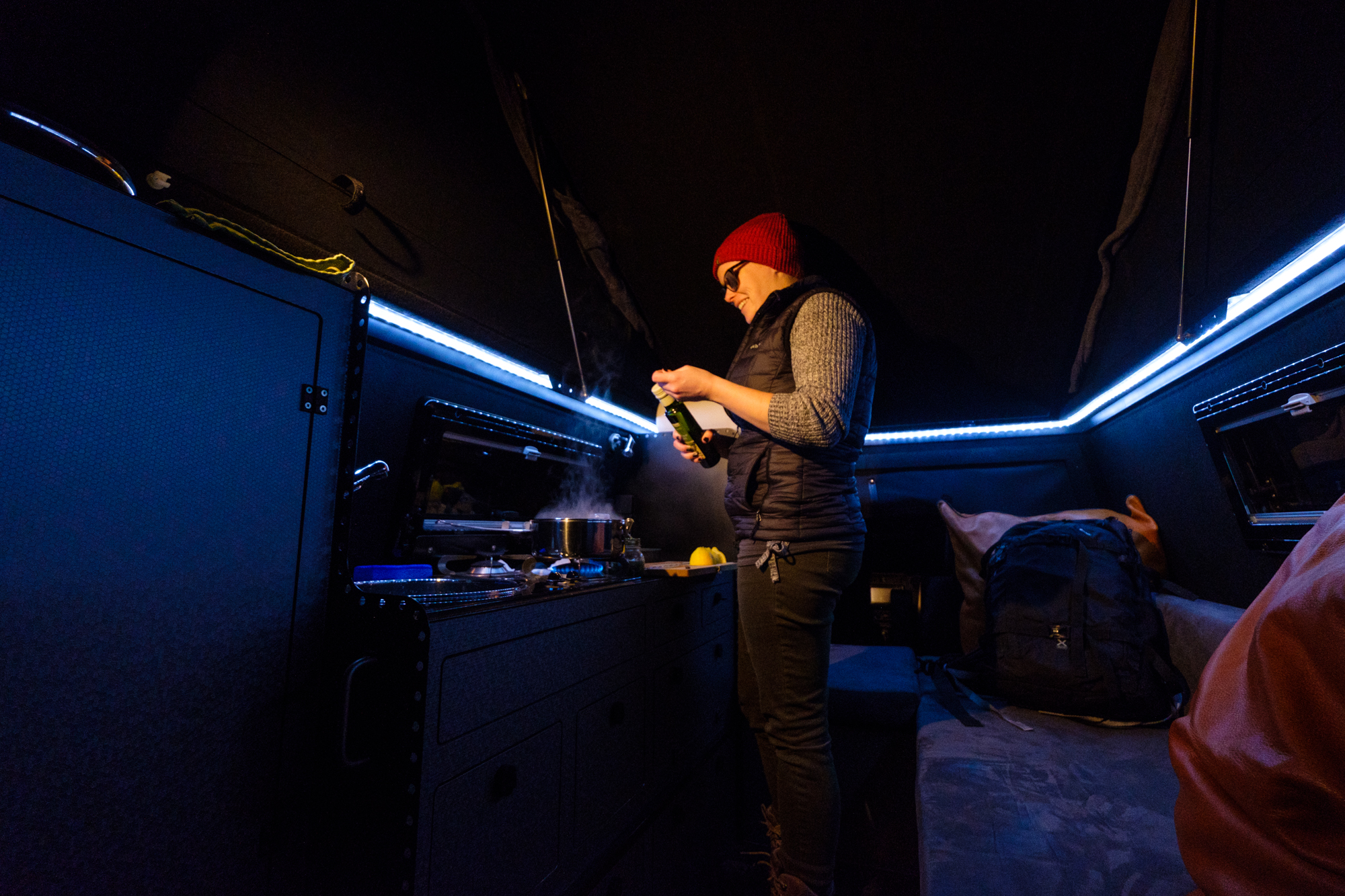 Fortunately, the park had one last parting gift for us: a golden sunset from the vantage of a peak far above the valley floor. My girlfriend and I slung our legs over the mossy stone wall and watched as the last rays of warmth vanished beyond the horizon, setting a chill in the air. It was going to be a very cold night. Loading back into the Maltec, I flipped on the heated Scheel-Mann seats, soaking us in warmth and comfort as we rambled down dirt roads toward our camp and a hot meal.