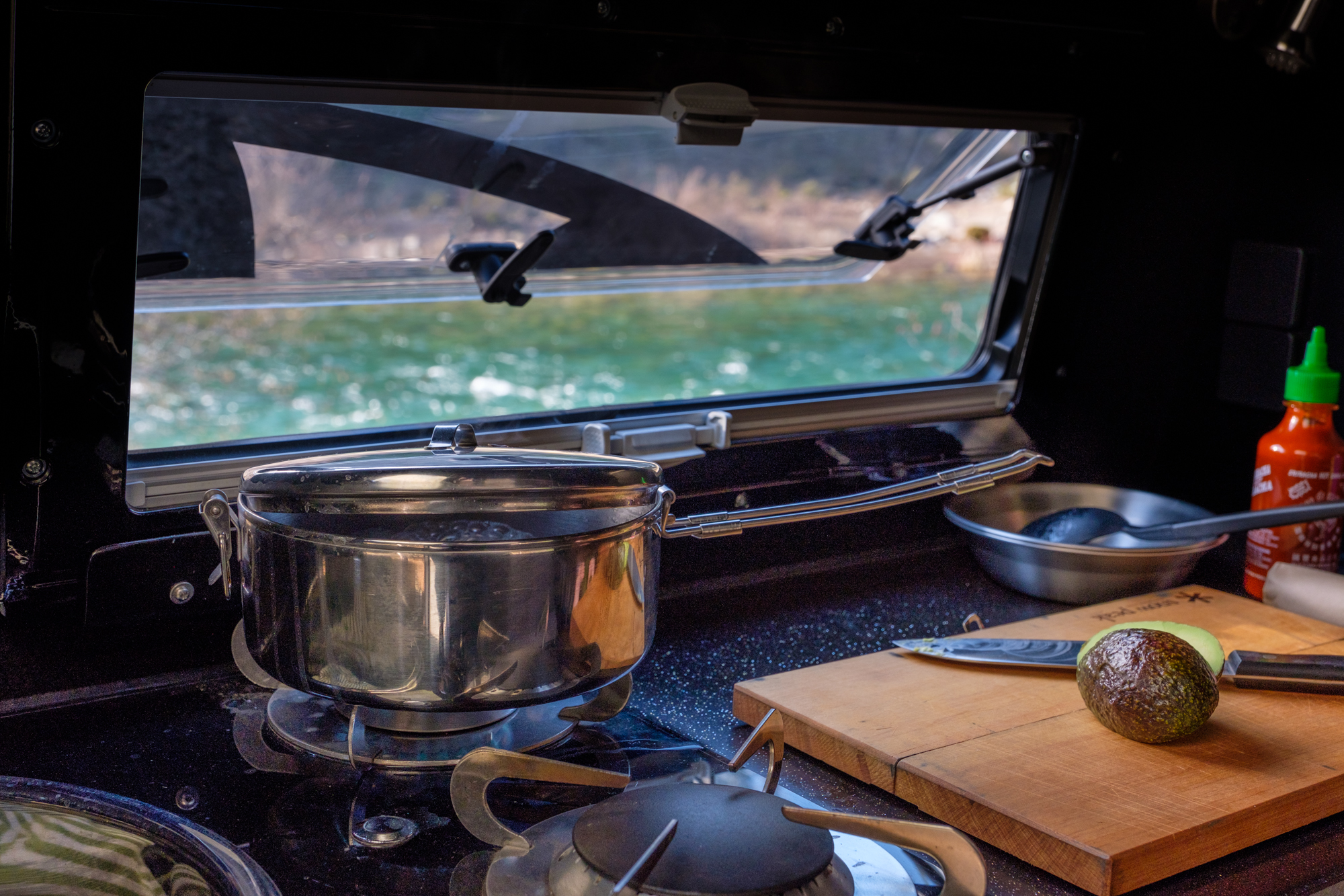 When we reached the bottom, our stomachs could be heard grumbling over the noise of the small diesel. We became aware that our conversation at the fuel station and little detour had cost us most of the morning, and we desperately needed to eat. Opening Hema Maps, I spotted a fork in the road just a few miles ahead. It was by a river, and I hoped it would be a perfect place to eat lunch. We cruised toward it, and to my delight found that our guess had been right. A small outcropping jutted out into the water where two rivers met, and the Maltec fit perfectly along the bank. It looked like lunch would be enjoyed next to the symphony of water rushing over rock.