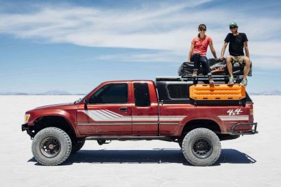 Two adventure-seekers and one red pickup.