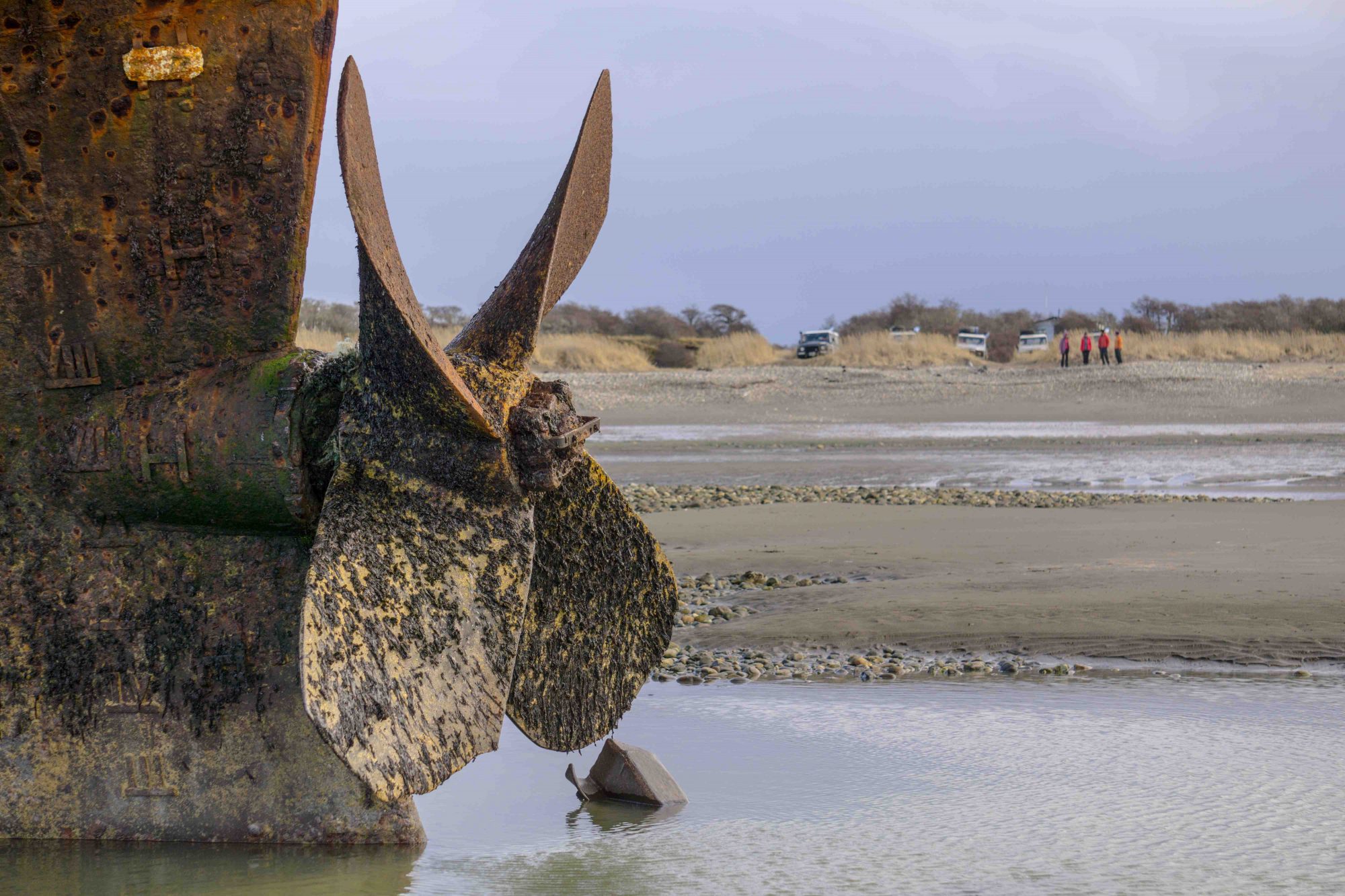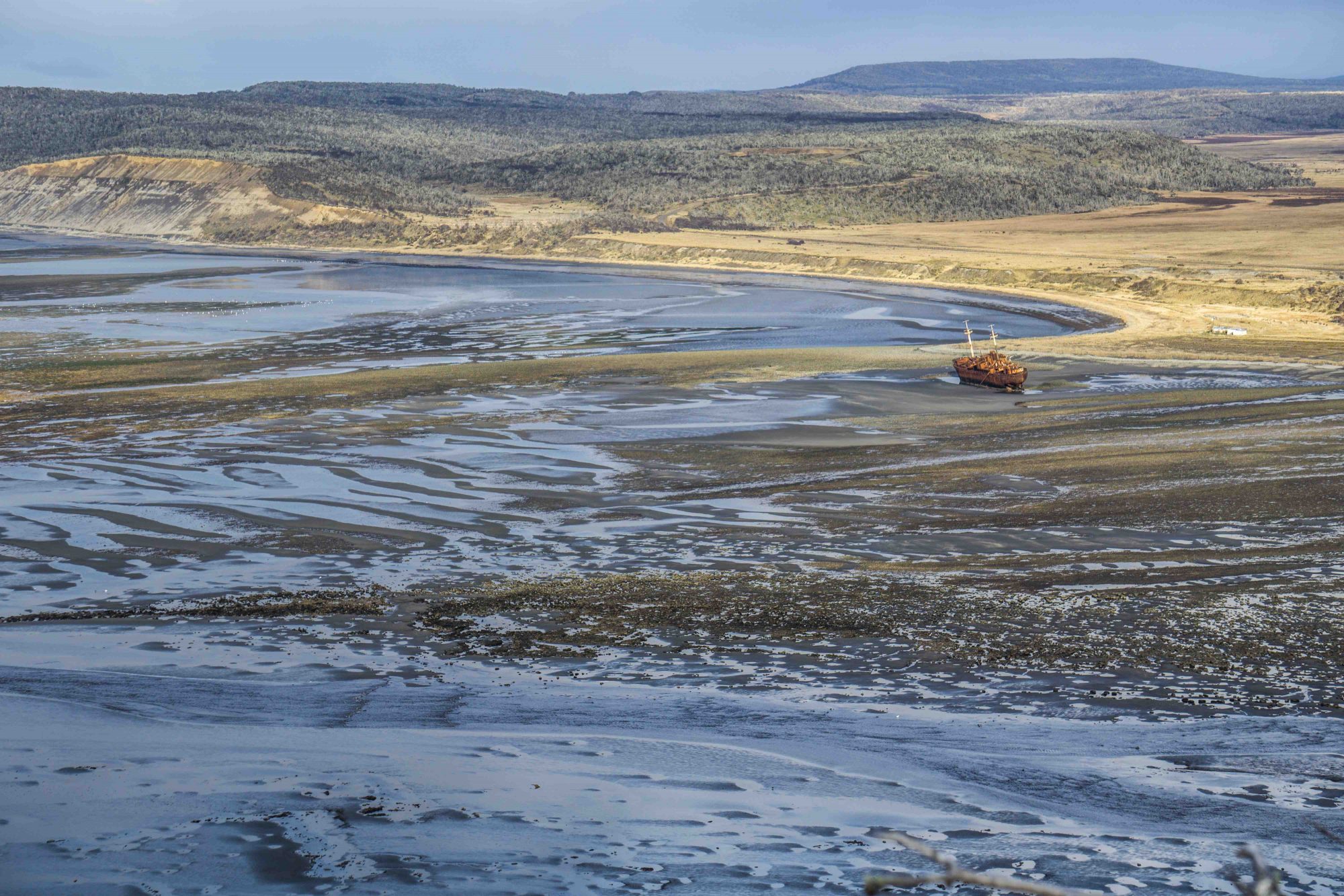 A steep and somewhat muddy climb to the top of the hill on the cape itself delivers a birdseye view of the shipwreck, the coastline, and surrounding terrain; it is well worth the effort. We enjoyed some hot mate to steel us against the now-falling rain while exploring the old lighthouse ruins and guessing to which animal the scattered bleach-white bones belonged. With no predators on the island, the guanaco or sheep bones were most likely picked clean by the large condors circling overhead.