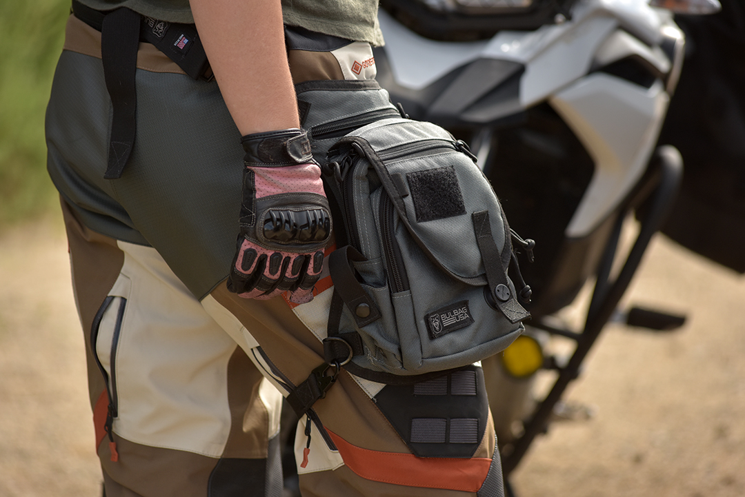 I appreciate Bulbag for its convenience in getting on and off the bike. Instead of cramming my tank bag with stuff, I tossed in my wallet, extra cash and keys, credit card, sunglasses, battery and charging cables, sunscreen, medication, bug spray, bear spray, a map, flashlight, a few small tools, and my favorite essential—lip balm. Bulbag doesn’t impede standing on the bike or getting on or off the bike, but it does assure your essentials stay on your hip (Bulbag can also be adjusted to wear across the body or as a backpack.) The zippered pockets are complemented by the main flap that offers a magnetic closure right where your hand drops to your hip. The added adjustable leg strap assures the bag isn’t going anywhere.