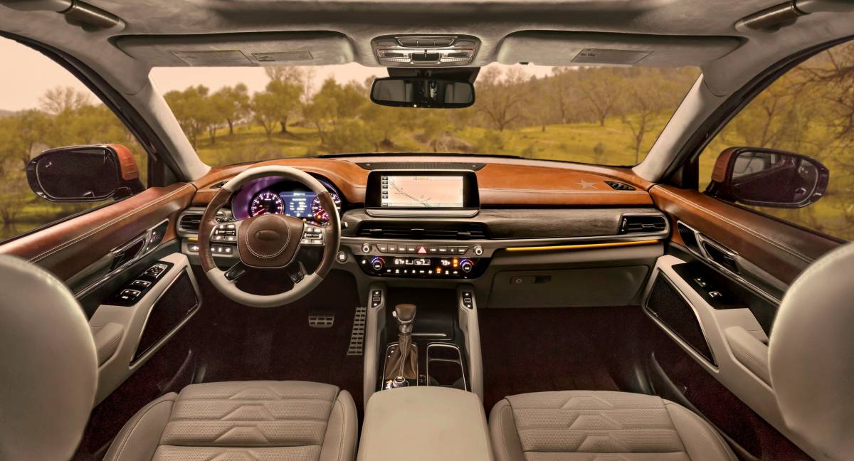 The interior features a look you would expect from a Texas-themed truck: beautiful wood accents, stars, and double-stitched leather in earthy tones.