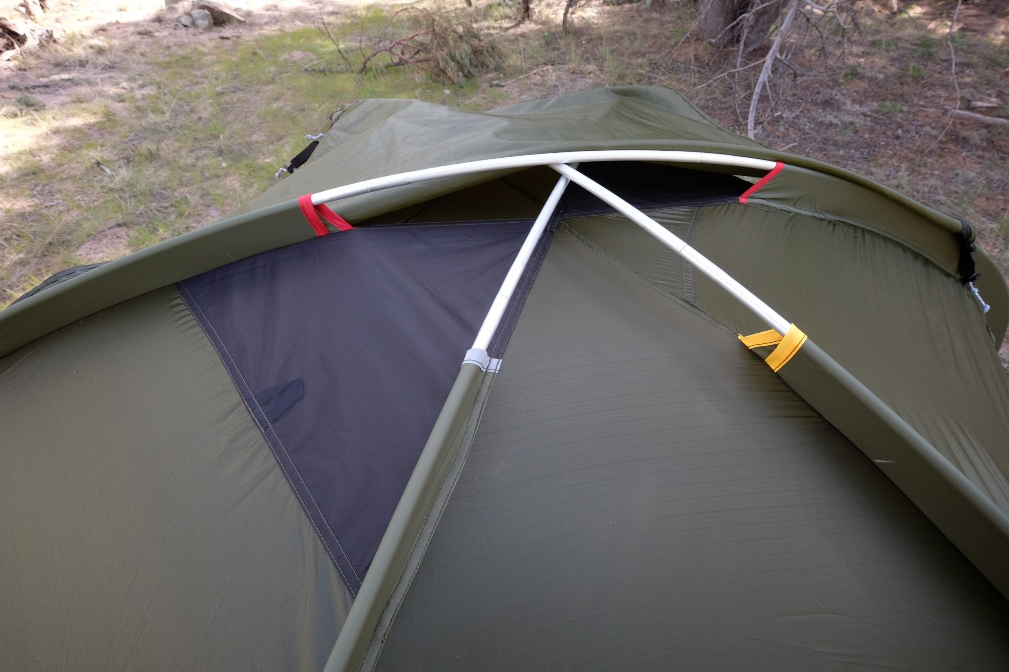 Color-coded pole sleeves help simplify setup. The large mesh peak panels are easy to reach from within the tent. The top cap secures with small toggles at six points.
