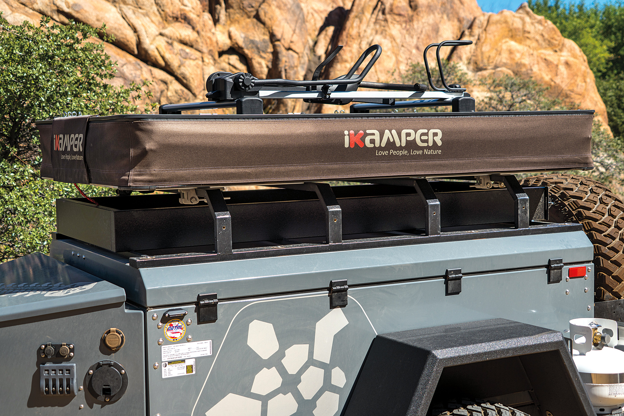 The iKamper company launched into the North American market with a unique hard-shell/ soft-shell hybrid that set up in one minute and permitted sleeping for four on a king-sized mattress. As a manufacturer, they have been deliberate with each new model and just released a third product called the X-Cover, which solves several of the frustrating attributes of clamshell tents—principally the cumbersome covers, long setup times, and loss of rack space for outdoor toys like bikes and paddleboards. The X-Cover abandons the typical PVC cover and retains a hard shell on the top for mounting a secondary rack. Dust and grime are kept off the tent with a belt of coated canvas that runs around the sides.
