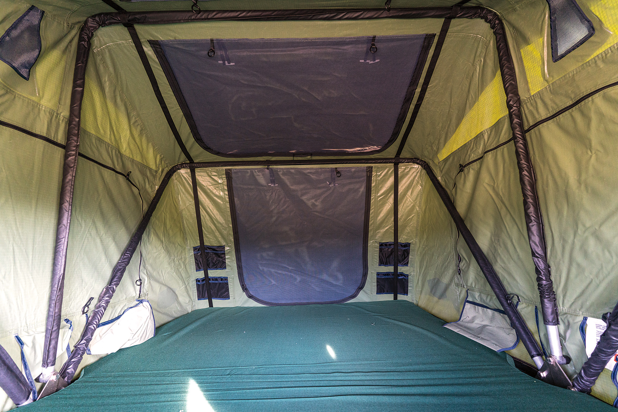 Comfort inside the roof tent is excellent with a thick, quilted mattress and heavy canvas walls. The entire structure exhibited minimal noise but rattled in the moderate wind I experienced when testing it at the Grand Canyon. Also unique in the test is the first time I have seen waterproof zippers used, and the moon window is a nice touch. This model will particularly appeal to travelers that want to bring bikes or other outdoor toys along for the trip.