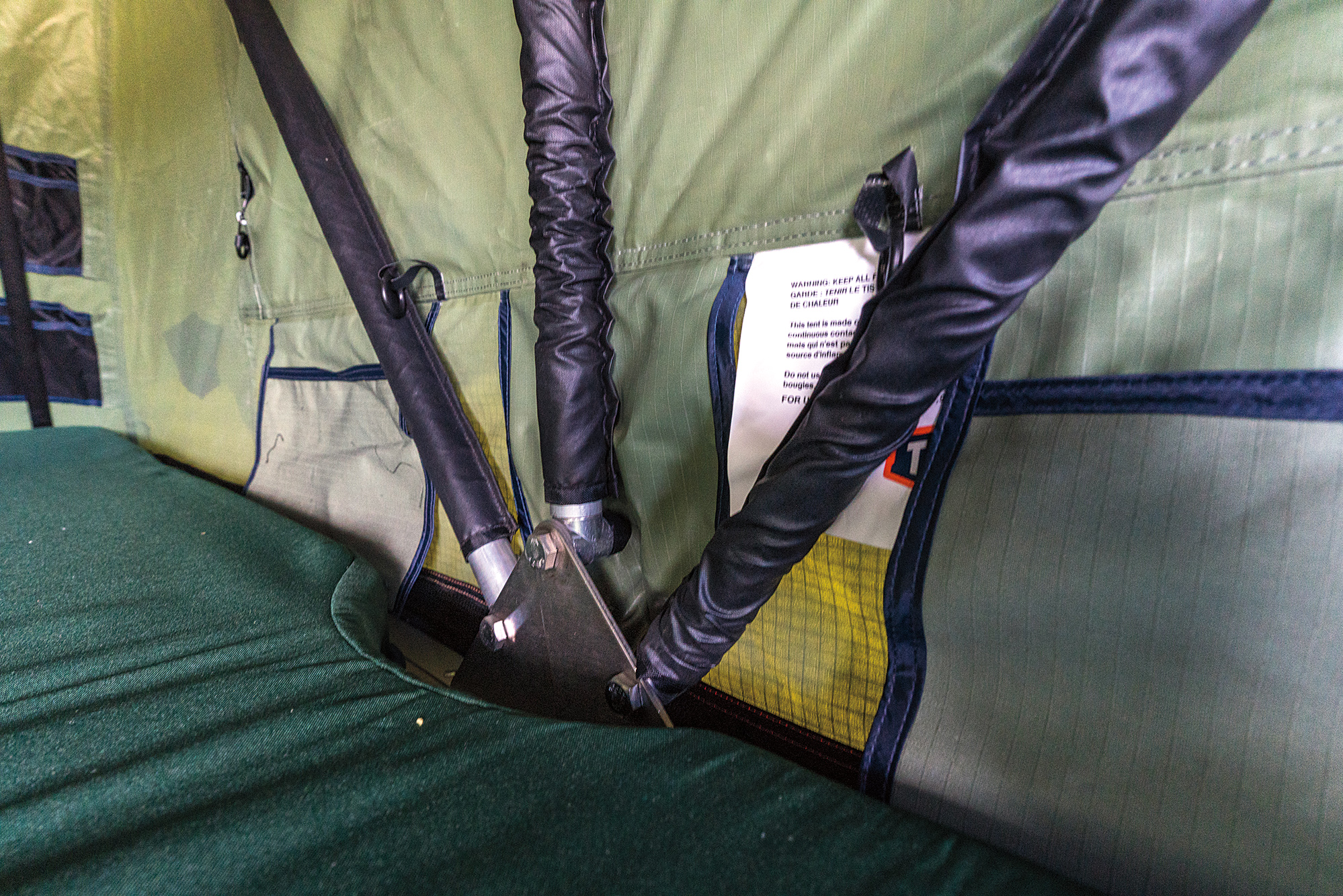 Setup is straightforward with the 1000-denier PVC cover removal requiring unclipping two girdle straps on the sides and then unzipping it from the base. I found the zipper to be slightly undersized for the intended application and the cover to be tighter than most, slowing setup and stow times. Next come the typical ladder deployment and fitting of the rainfly and side window rods. The small slits in the tent walls made it more challenging to insert the rods in the steel window and awning supports. The six windows and two vents provide superb ventilation.