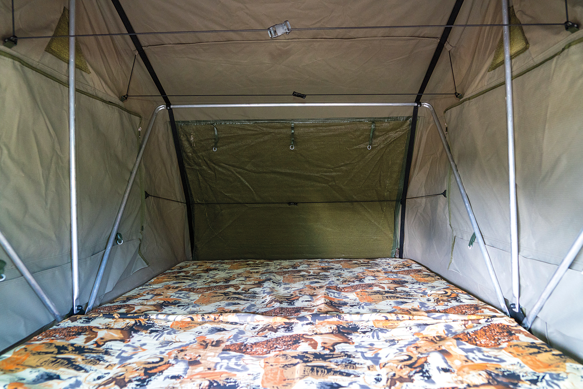 Further inspection of the tent shows quality materials at every corner, starting with the ladder extrusions and extending to the double-stitched ripstop canvas tent body. The base is made from 9-millimeter marine plywood, reinforced with meranti timber and aluminum angle. Additional rigidity comes from long sections of extruded aluminum on both the rack side and ladder side. This all translates into a stable and durable structure. The ladder is extremely sturdy too but is one of the more difficult in the test to work with. The ladder length needs to be set by drilling into the extrusion for the height of the vehicle, but that can prove problematic in uneven terrain and necessitates an optional extension for taller 4WDs. The ladder is uncomfortable with bare feet, each rung a narrow metal step. Inside, the thick canvas proves a dark cave against light ingress, and the 2.5-inch, high-density foam mattress is covered in a fun African print—you can almost hear the lions roaring in the distance.