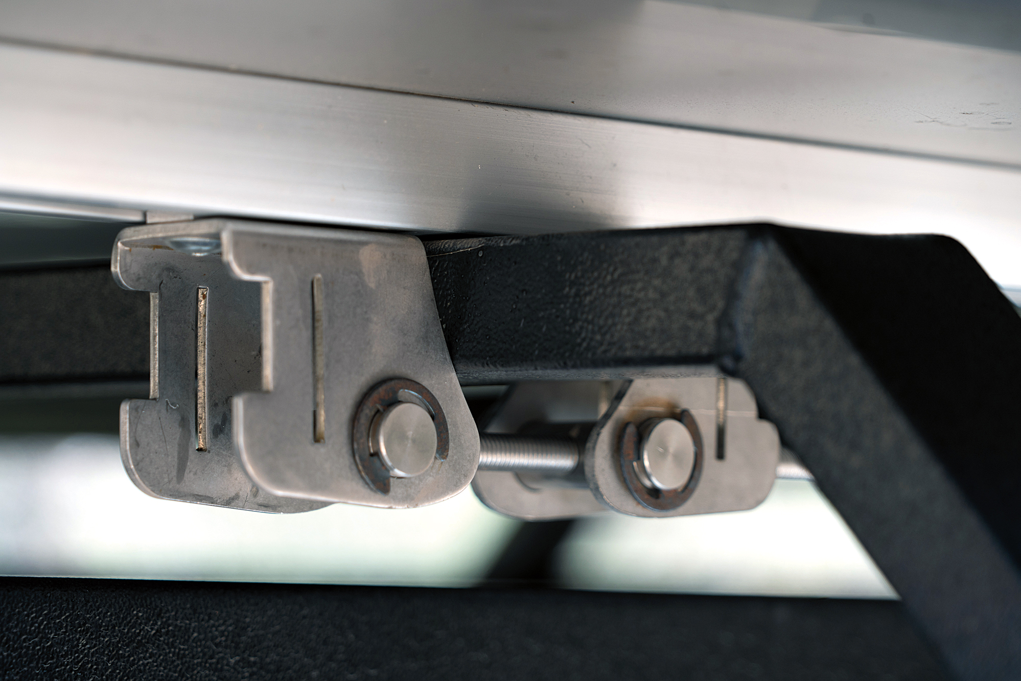 Unboxing the Feather-Lite requires minimal assembly, as the roof rack extrusions need to be mounted based on the desired orientation of the ladder (to the side or the front/back). The supplied mounting hardware slides into the aluminum extrusions and clamps to the crossbars with thick plates or to a rack with available brackets. The cover is made from PVC and uses two straps over the top to prevent billowing at highway speeds. Setup starts with unzipping the cover, and the zipper was lighter duty than several in the test. With the cover off, a few compression straps are all that is left before pulling the tent open. The rainfly is large and provides expansive rain protection. It uses fewer poles than other tents, relying on a single spring steel rod for the side windows. The rainfly can be completely removed for additional weight savings in gentle climates. However, this function can also allow for the fly poles to pull out of the tent sleeves in even moderate winds.