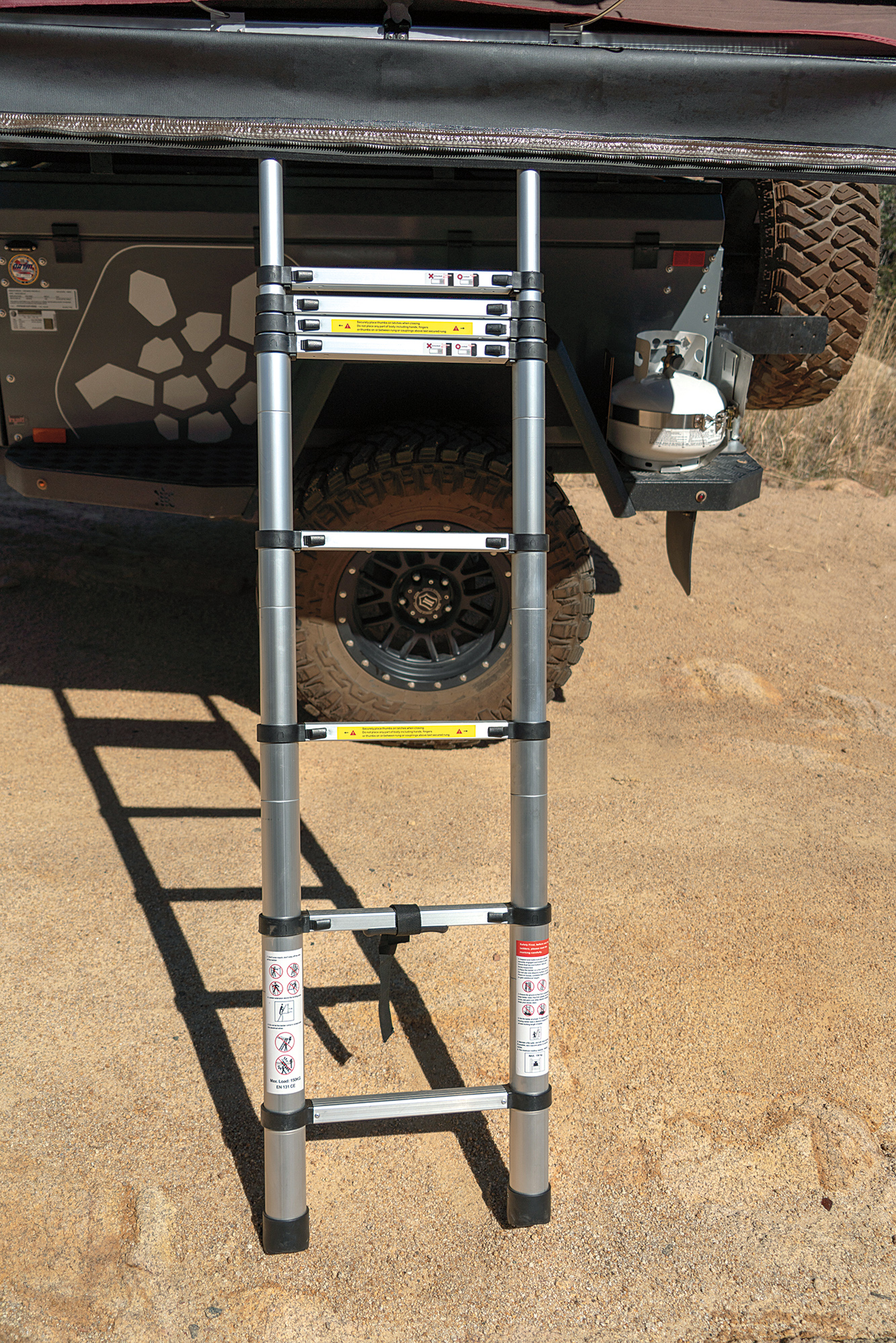 In use, the tent is extremely comfortable with one of the best mattresses: it’s 2.5 inches of high-density foam with a .5-inch anti-condensation mat. Tepui also included hold-down straps that keep the mattress and light bedding in place while the tent is folded. The 600-denier, ripstop tent walls are thick and quiet and fully weatherized to allow for a four-season rating. Nylon-wrapped, .75- inch aluminum framework supports the canopy. There are plenty of pockets, and two massive rafter ventilation windows fill the ceiling. Other thoughtful features are included, like gear hooks by the front door and under the support platform. The ladder is sturdy and well-made and extends to 8 feet, 6 inches for even the tallest trucks and SUVs. All of these attributes make for a true around-the-world tent.