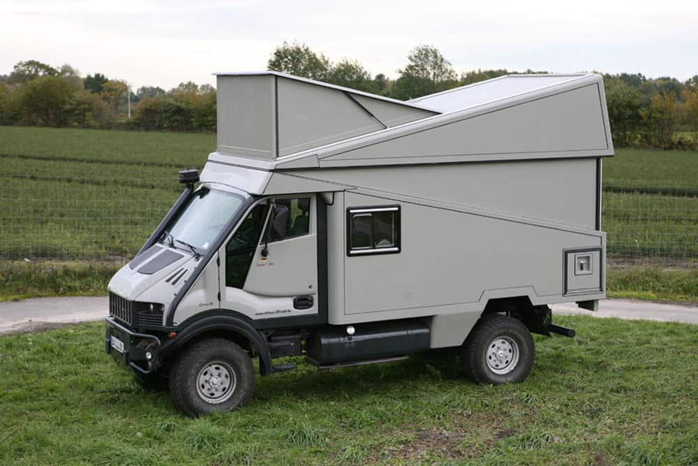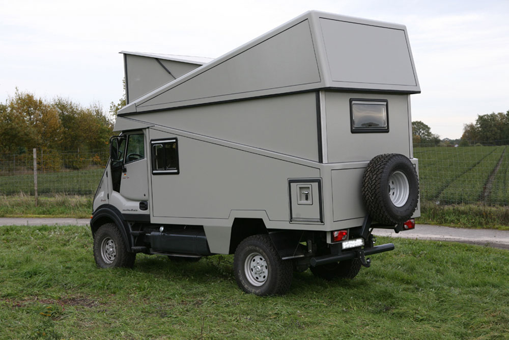The interior is elegantly simple (photos are scarce) with efficiency being the main design driver. Knowing it will be the living quarters for four adults, storage space was clearly a primary concern. The 200 liter fresh water storage tanks have their own filtration and hot water systems, and high wattage solar panels provide the additional power needed for a larger group of travelers. The unique forward pop-up section accommodates two sleepers in an elevated loft, and the aft pop-up adds additional height above the vehicle’s galley and shower. It’s impressive from all of its many angles.