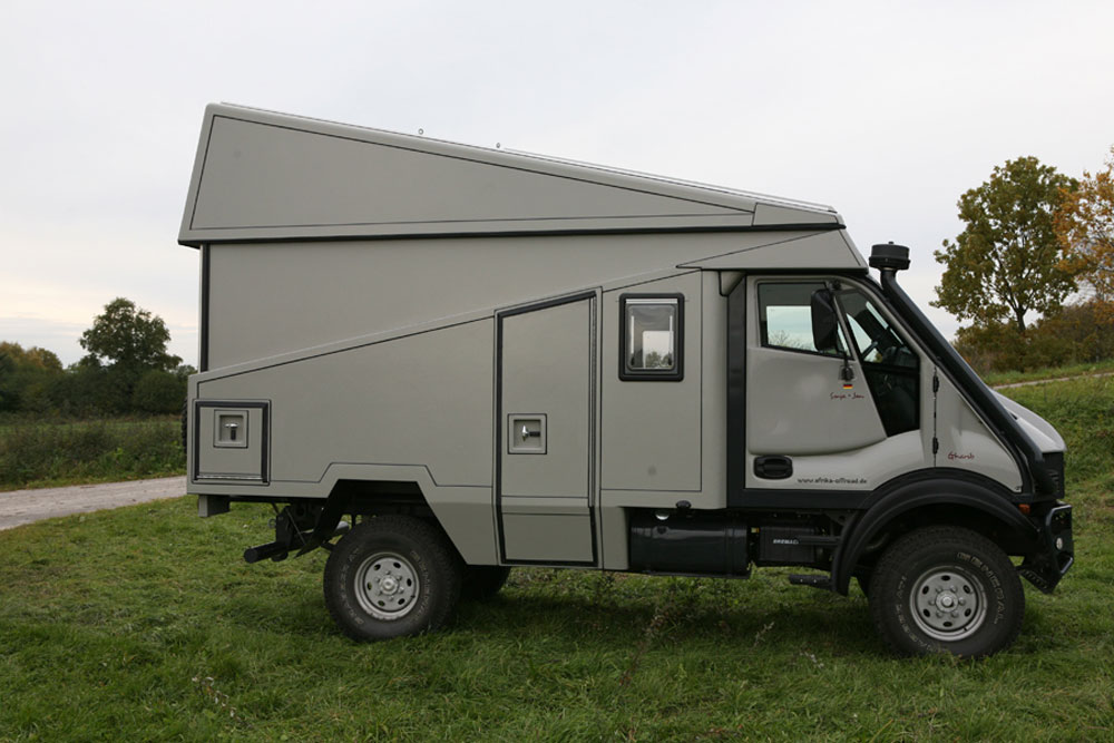 This is quite possibly the coolest truck you’ll see all day. Images of this beauty have been whirling around the internet for well over a year, but with very little information available. A quick peek at the decal on the door of the truck leads us to Afrika Offroad, a protracted expedition previously based out of a Land Rover Defender and piloted by German couple Sonja and Jan Gehler. This new platform, built on a Bremach T-Rex, is an impressive beast of a thing. With seating and accommodations for four, this new vehicle was fabricated with assistance from expert designer Marcus Haase.