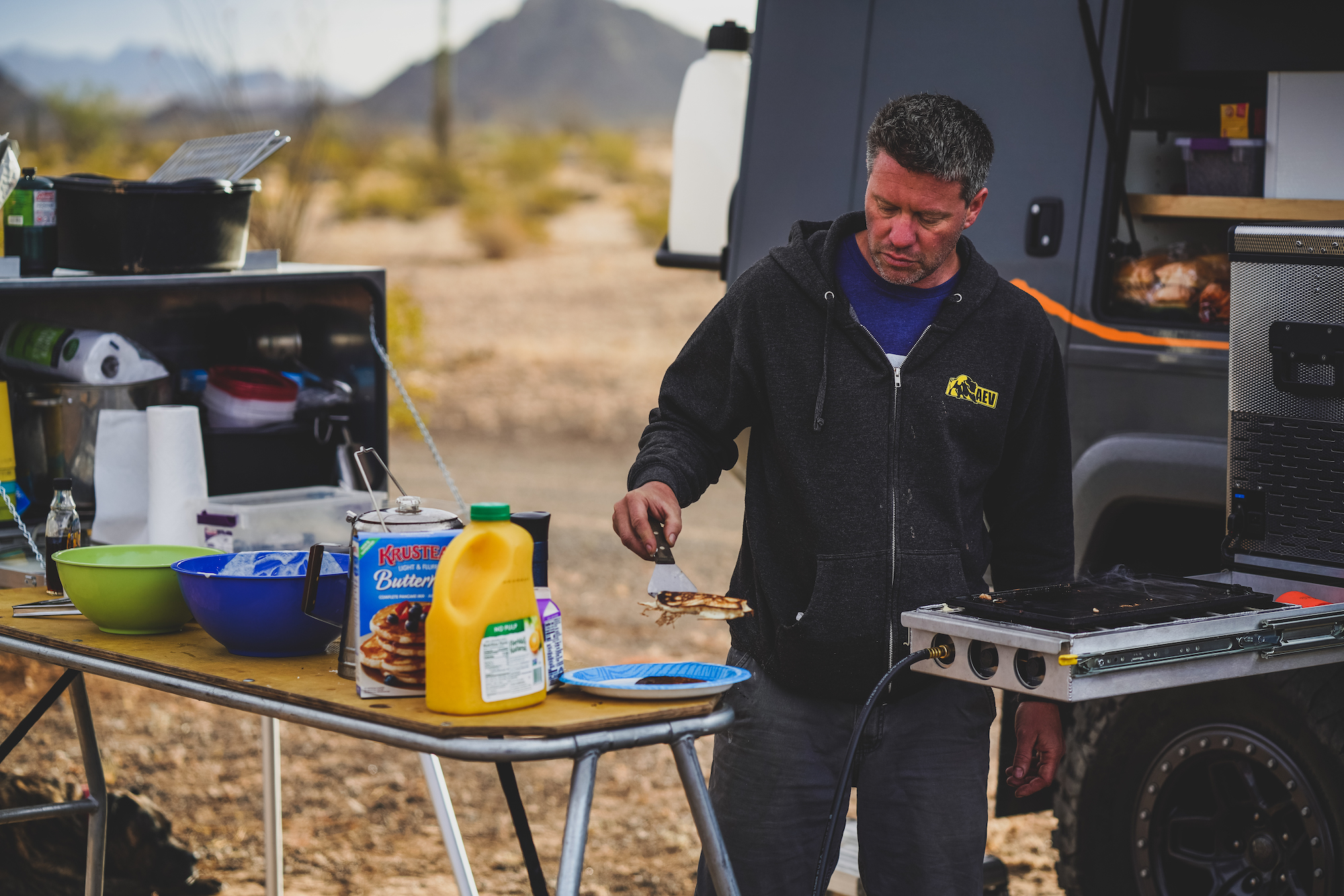 There were a few other pieces of kit that worked like a charm, including the mess kitchen that Dave brought along. It is designed for whitewater rafting trips, so it was extremely robust and also collapsible. The entire unit was constructed primarily from aluminum and is well sealed from both water and dust. This made for a perfect gathering place at the end of the night and early morning to prepare meals and clean dishes. Dave would set it up next to the Outpost, which had a National Luna fridge on an exterior slideout—ice cream for everyone. He also used a semi-porous drop cloth to keep the entire area relatively clean and organized. I still remember how good the pancakes and bacon tasted deep in the Sonoran Desert
