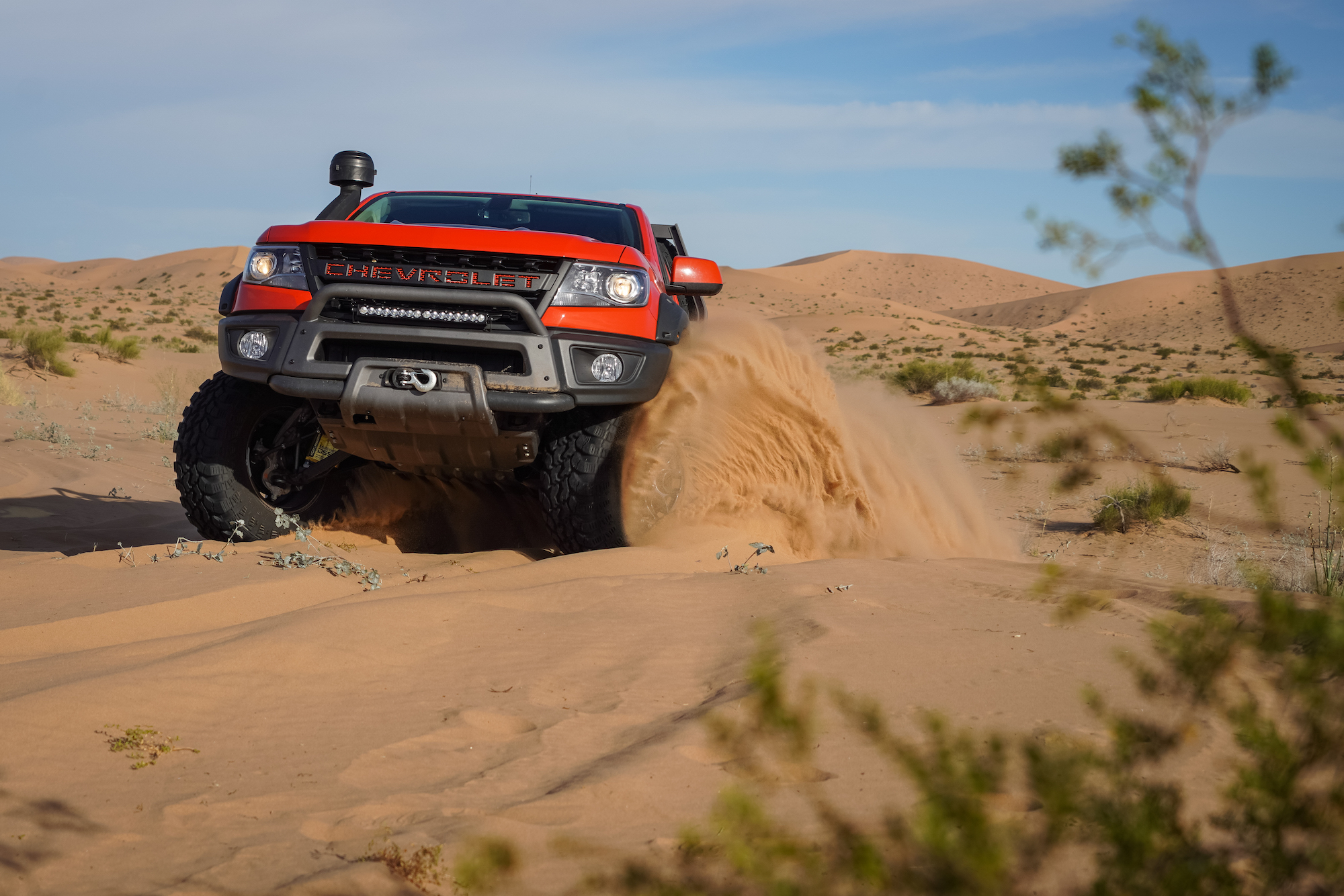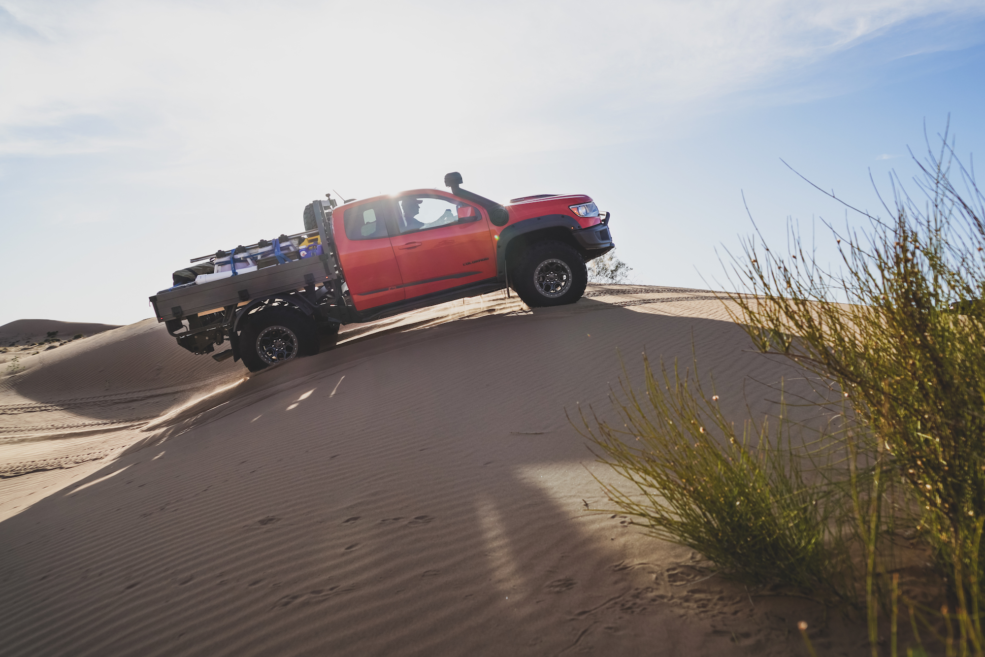 In contrast, the Jeeps and Chevrolets for this trip were equipped with significantly taller and wider tires, the smallest being a 35-inch Interco on the Colorado Bison. The Wranglers sported tires as large as 37 inches and benefited from higher horsepower V6s and 8-speed transmissions. The Wrangler JK Outpost enjoyed the bark of a Hemi V8. As a result, the drivers were able to attack taller dune faces with shorter runups, and even correct for a poor line choice or loss of momentum with a press of the accelerator. The suspensions were also significantly modified, complete with taller springs and custom-tuned shock absorbers.