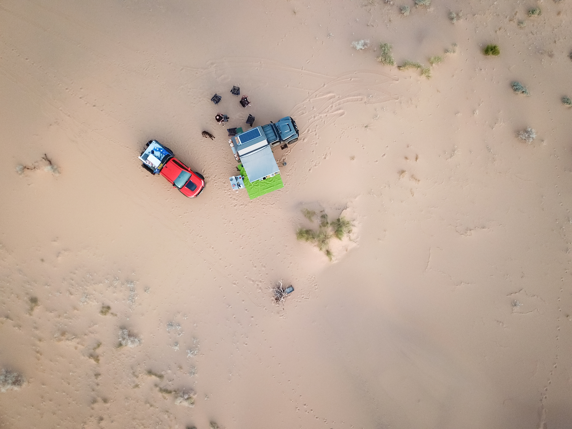 For the rest of us, various degrees of success were experienced when sleeping in tents on the ergs. On the second night, the wind blew hard and pulled at the stakes in the soft ground. The stakes were better than the typical bent rods, a cross shape of extruded aluminum with more surface area, but not enough. Tent pegs pulled free, and one tent tumbled for several meters before being stopped by the side of a truck. We improvised and used the vehicles as windbreaks against the silica still pummeling the thin walls and mesh. Being three-season tents, the designs were all intended for increased airflow, which also allowed a steady cascade of sand to fall inside and collect on the sleeping bags and us. It was no fault of the tents we used, but this was a lesson learned for next time: either sleep inside the vehicles or bring four-season tents that can be fully sealed on the windward side (still allowing for some airflow on the leeward side).