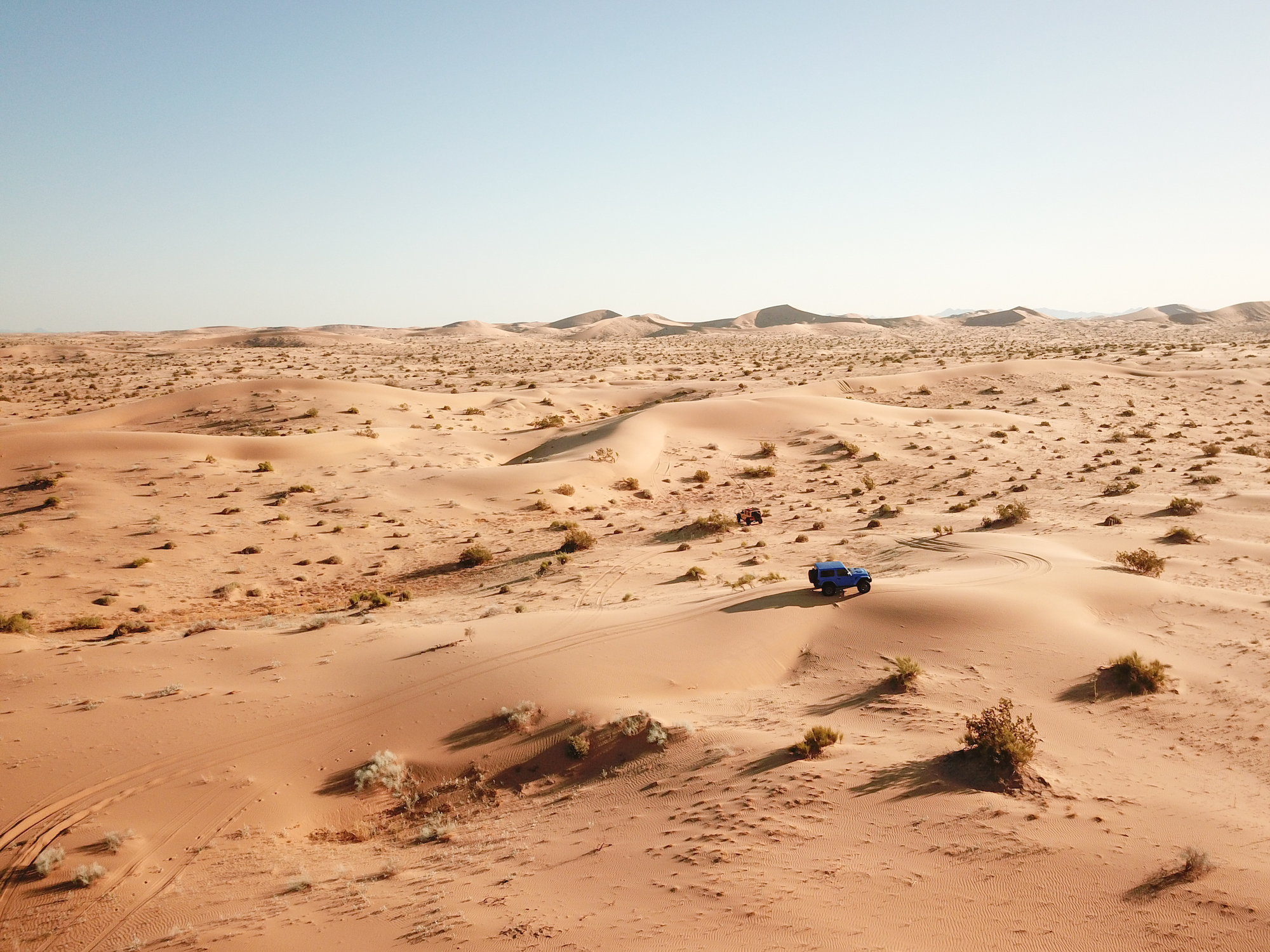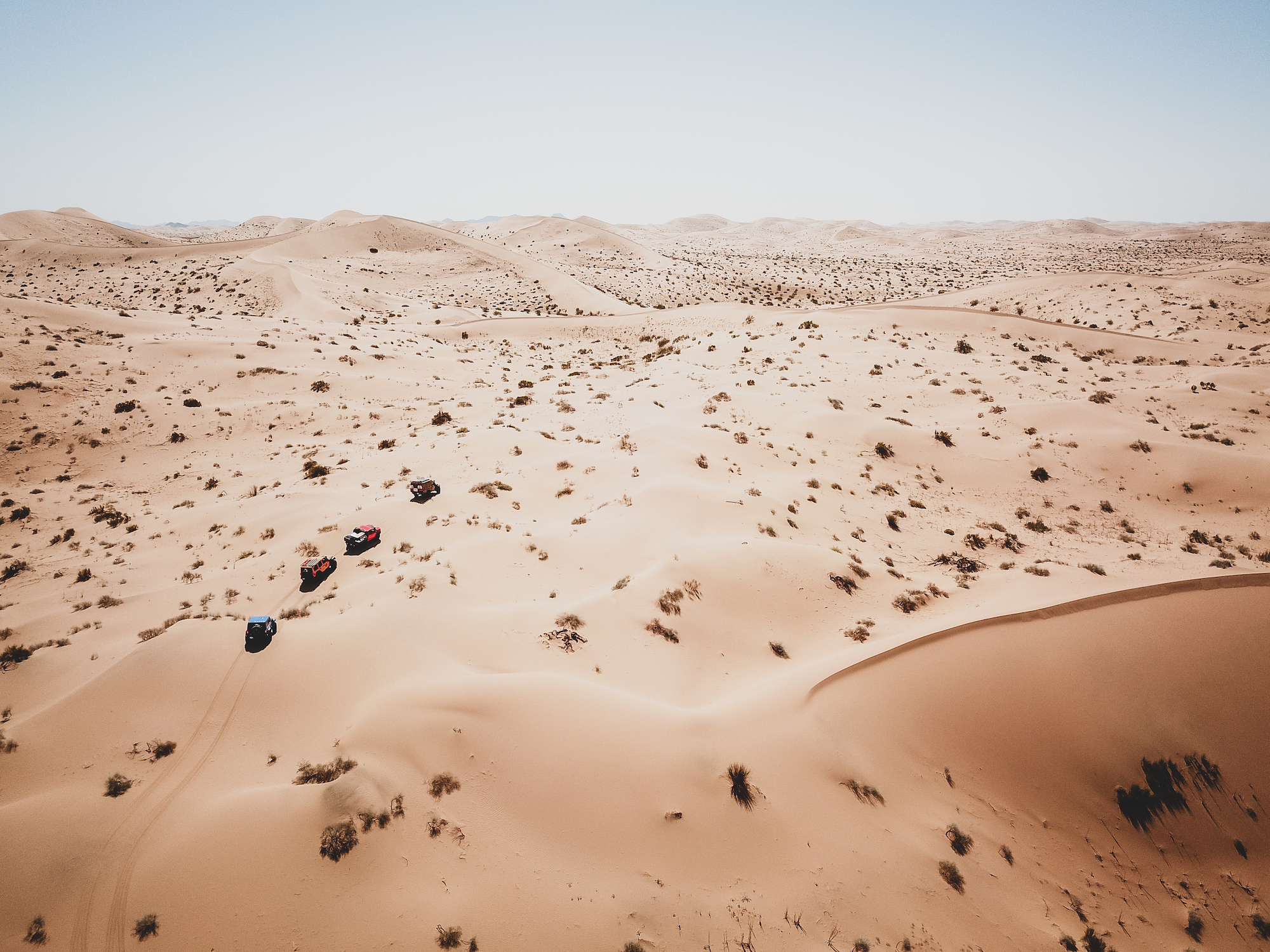 The Hemi barked to life, squatting the rear of the Wrangler, accelerating us up the face of the dune. Dave did his best to navigate the aggressive camber of the slip face and the large bush that blocked the cleanest line to the top. The transmission hesitated, downshifting too late and causing the tires to break free from the available flotation. Instead of accelerating more, Dave backed off the throttle and came to a controlled stop. Even with 37-inch tires and a 400-horsepower V8, the soft silica was too much, and a different tack was required. Backing down would have been difficult, and the Jeep was already listing heavily to the driver’s side. It is moments like this where someone’s true experience shows through, the 10,000 hours that come to a practitioner of their craft. Gently, Dave rolled the vehicle rearward ever so slightly, bringing the tires to the rear lip of the small hole dug when the tires spun. He used that position to restart the climb, and we progressed another foot higher. Again, he backed off before the vehicle was grounded to the frame, and another attempt was made—the perfect balance of momentum and acceleration moving us forward a few feet. With one rock of the throttle, the Wrangler hooked up, and we started building momentum to the top, to the cheers of our teammates on the crest.
