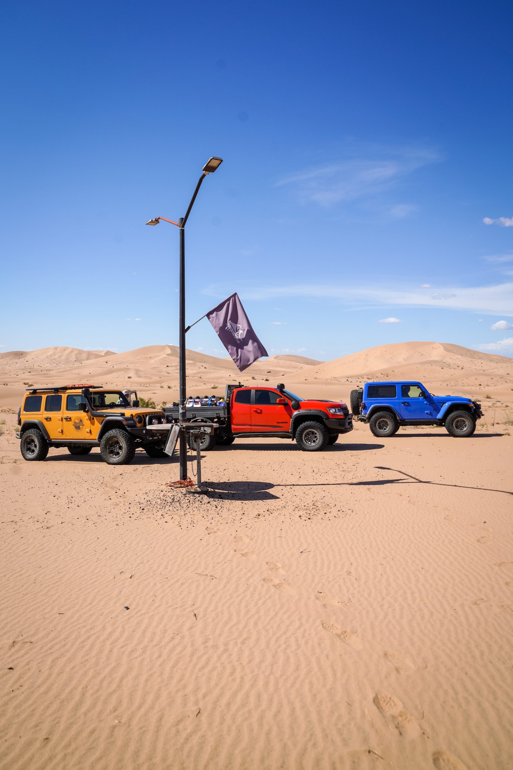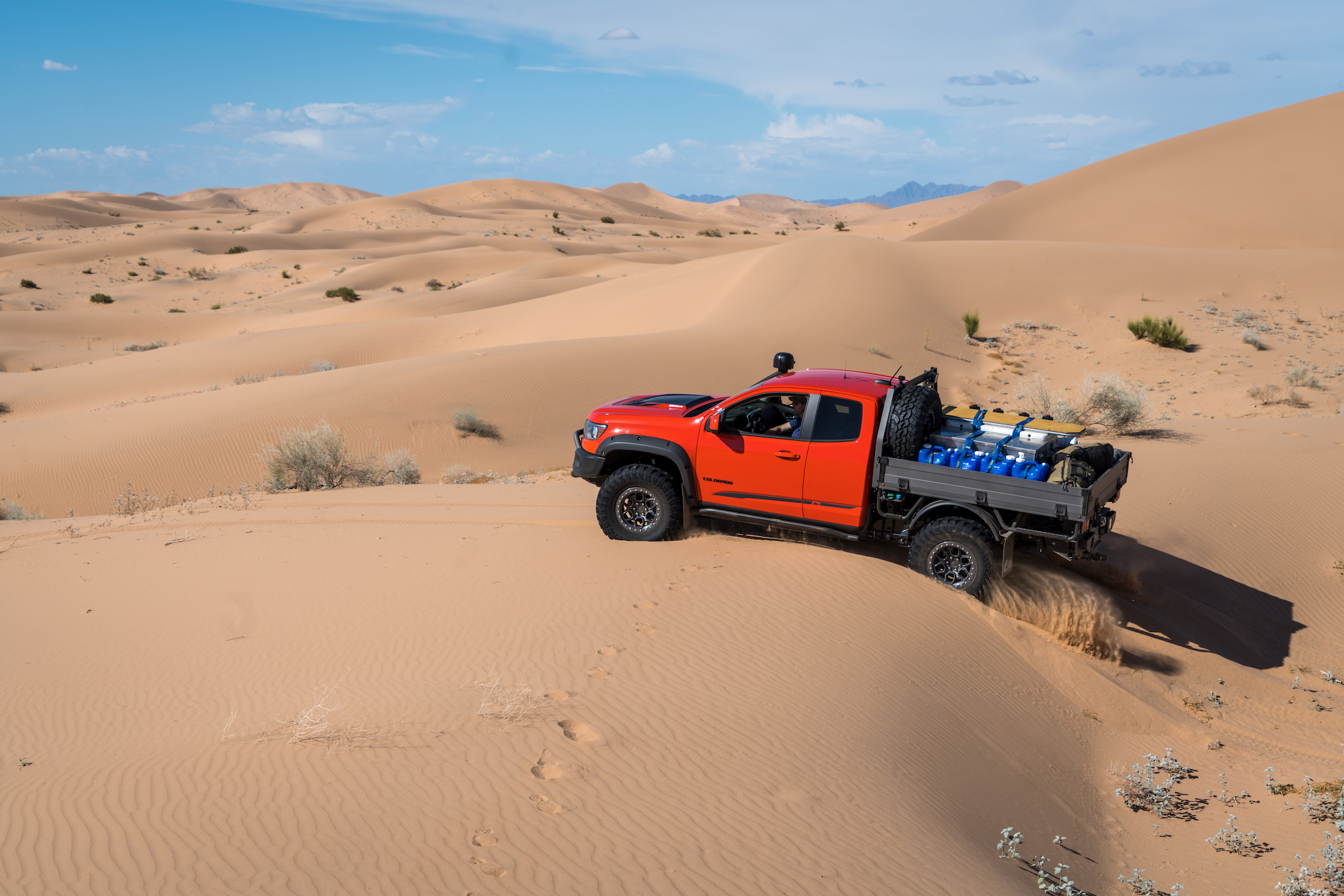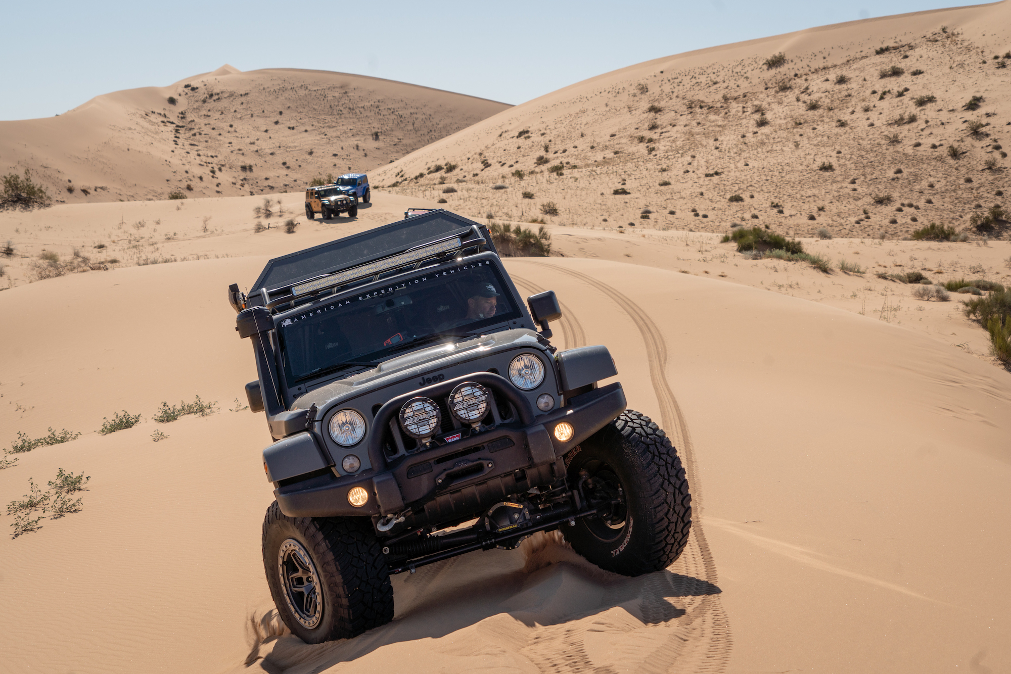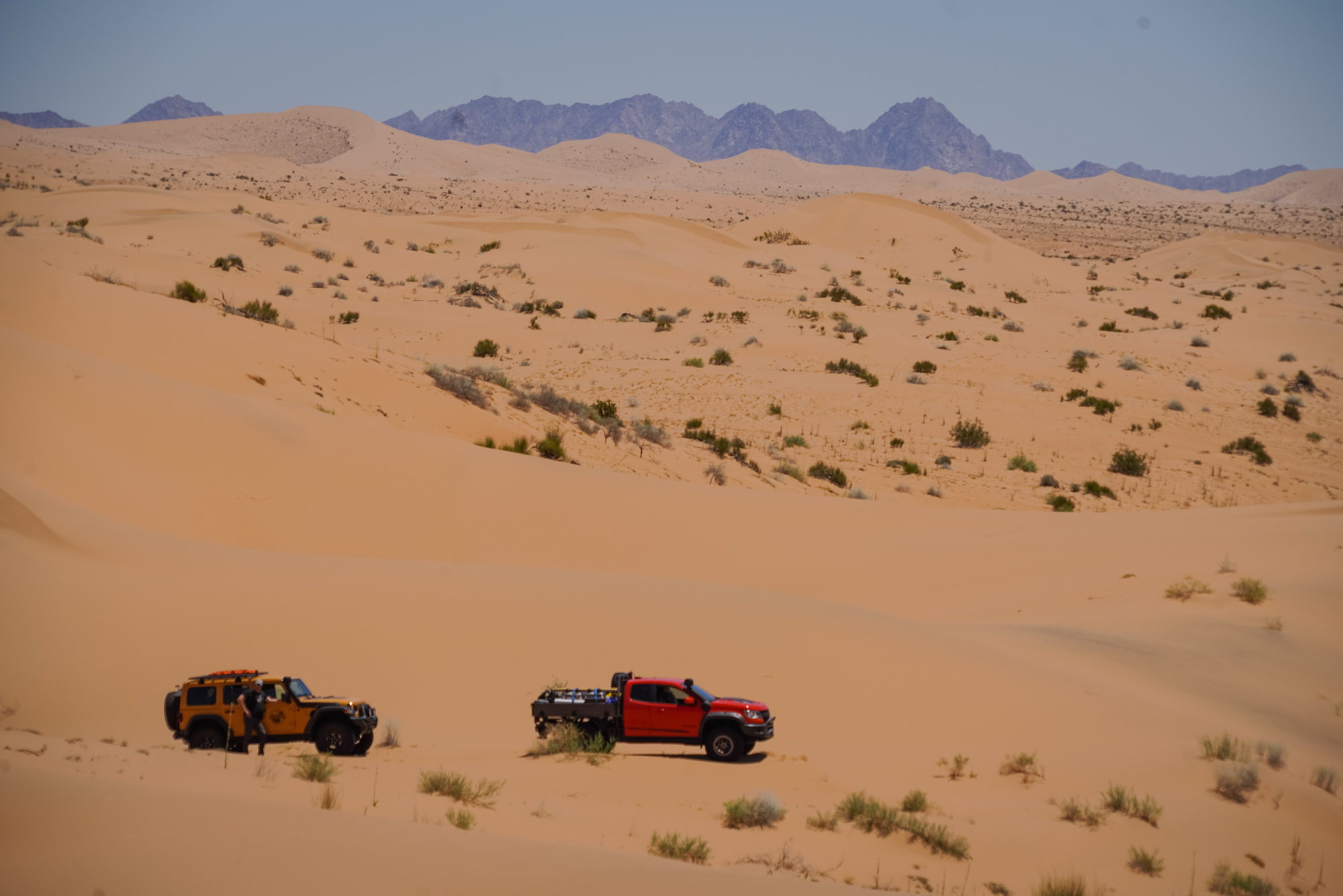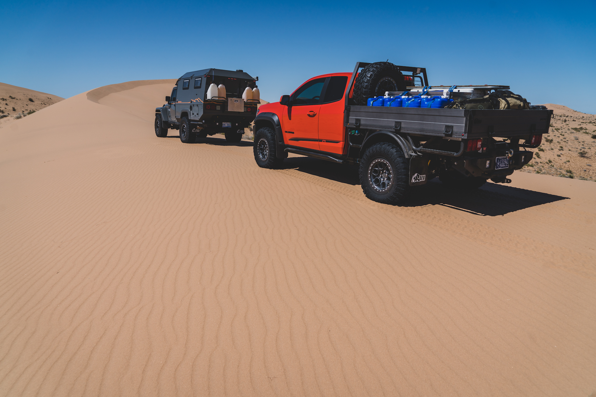 In contrast, the Jeeps and Chevrolets for this trip were equipped with significantly taller and wider tires, the smallest being a 35-inch Interco on the Colorado Bison. The Wranglers sported tires as large as 37 inches and benefited from higher horsepower V6s and 8-speed transmissions. The Wrangler JK Outpost enjoyed the bark of a Hemi V8. As a result, the drivers were able to attack taller dune faces with shorter runups, and even correct for a poor line choice or loss of momentum with a press of the accelerator. The suspensions were also significantly modified, complete with taller springs and custom-tuned shock absorbers.