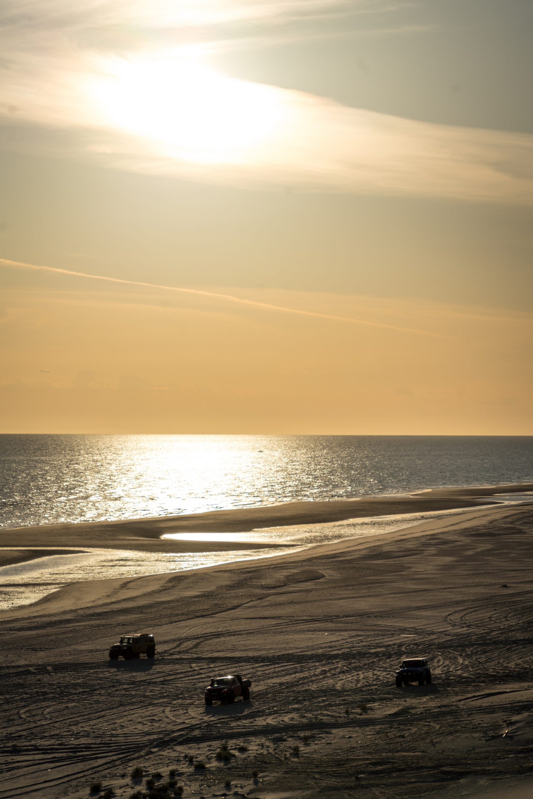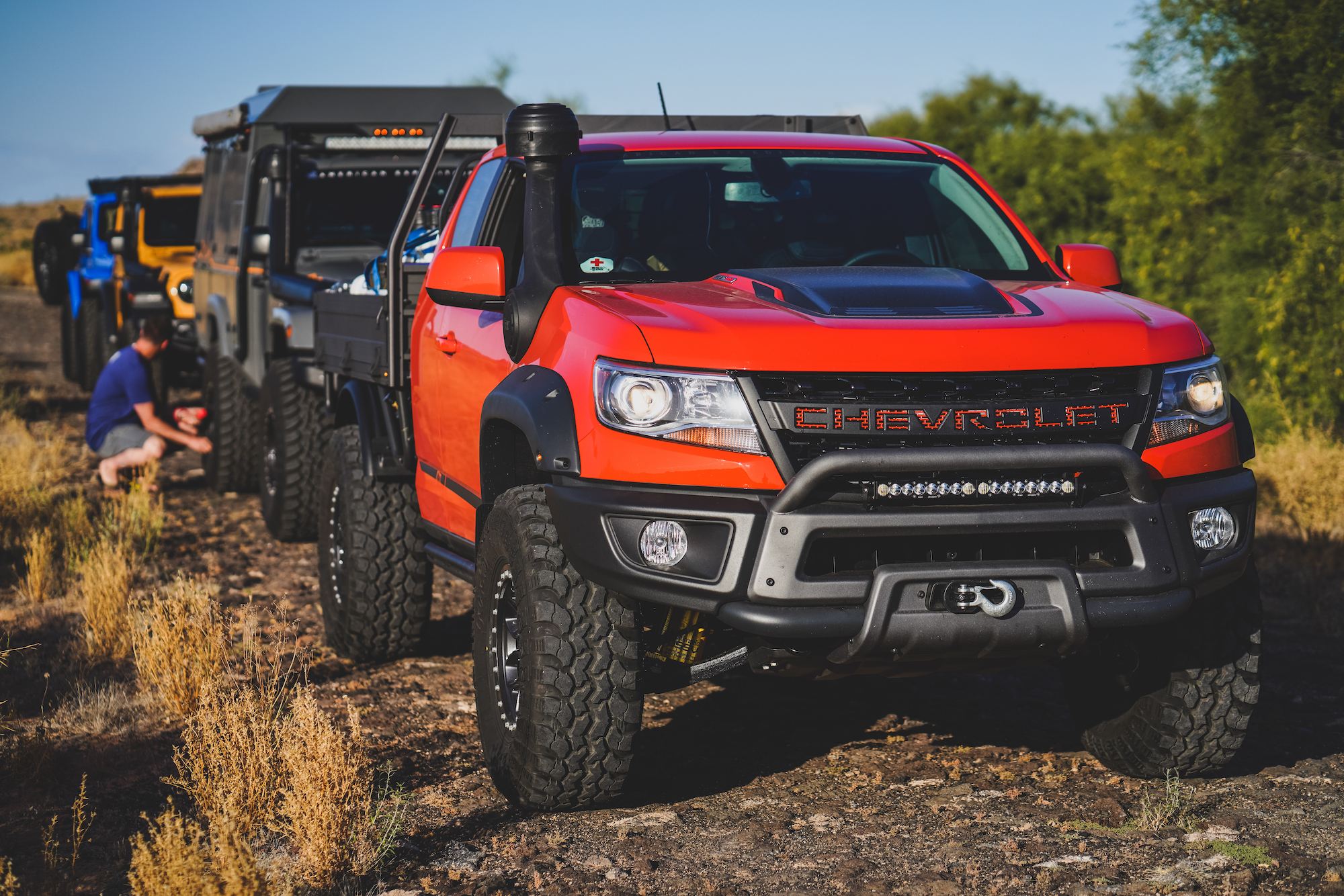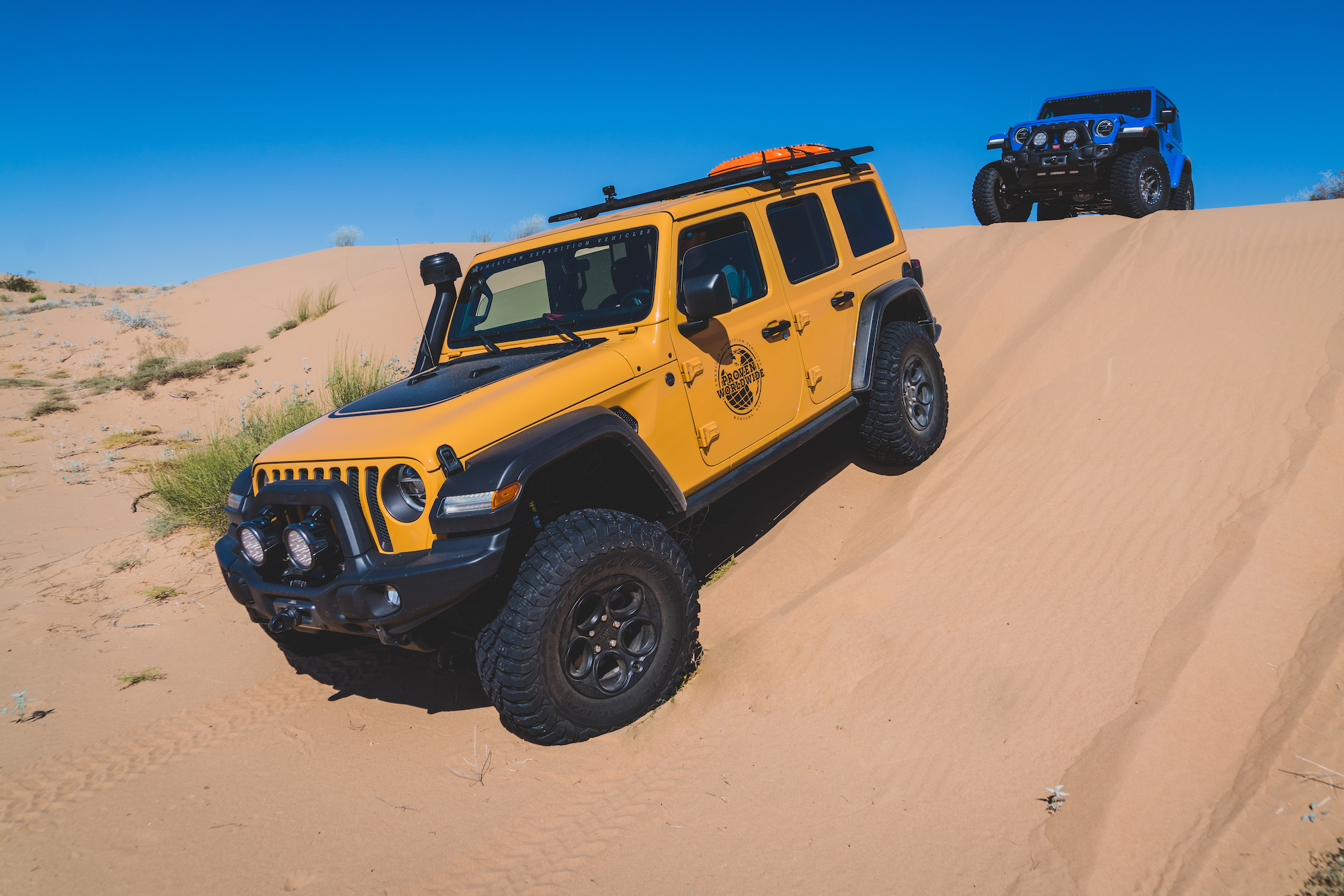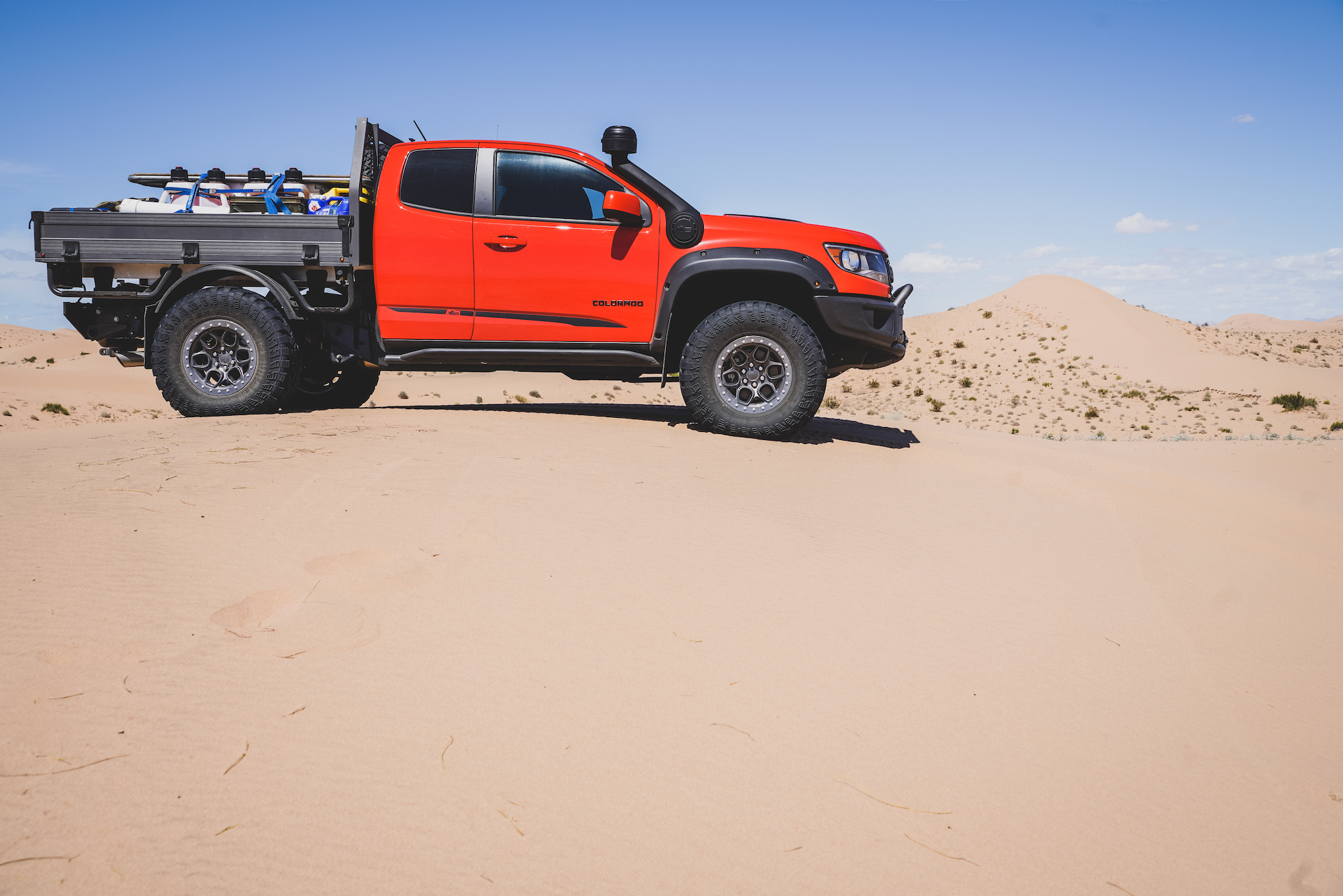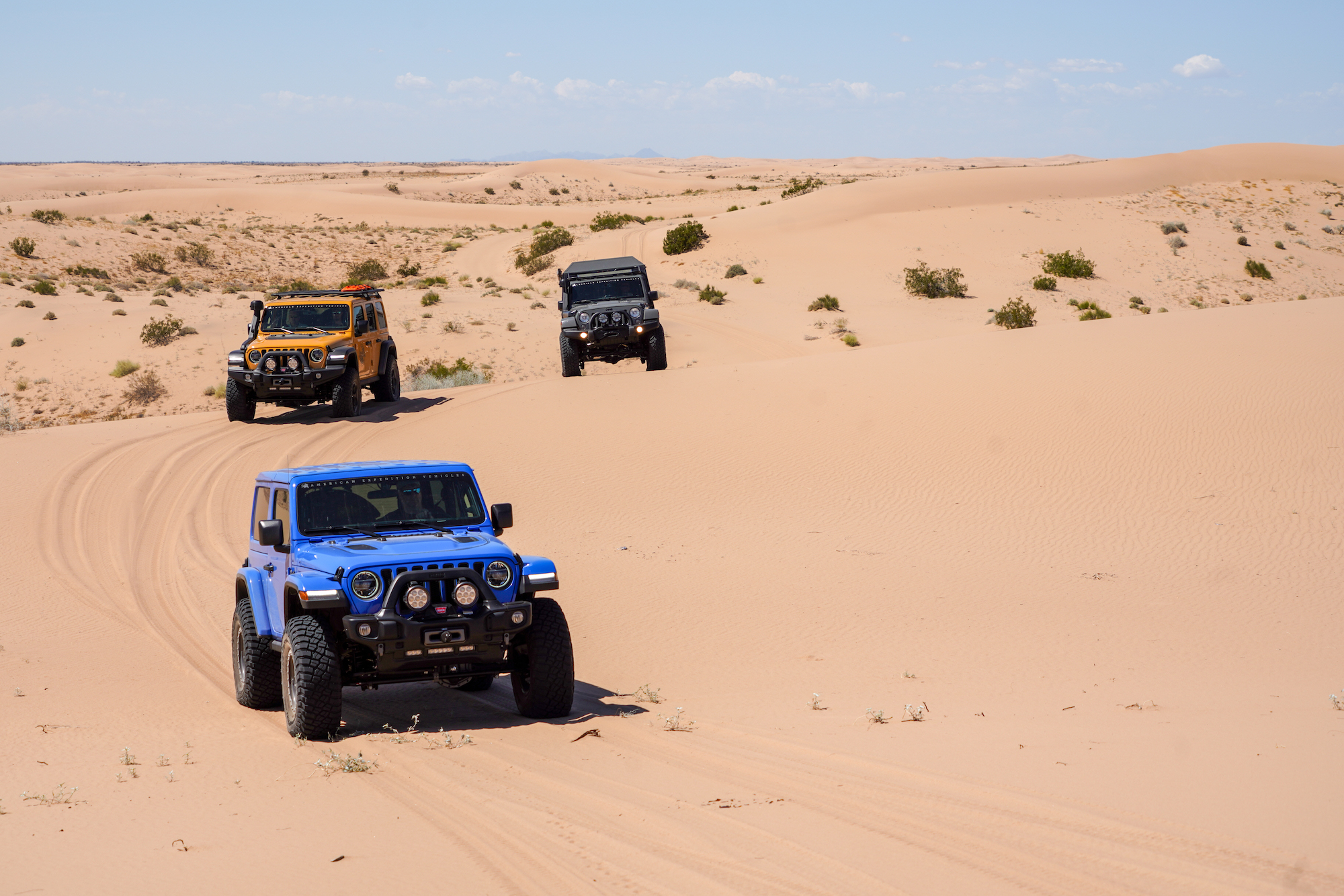 In contrast, the Jeeps and Chevrolets for this trip were equipped with significantly taller and wider tires, the smallest being a 35-inch Interco on the Colorado Bison. The Wranglers sported tires as large as 37 inches and benefited from higher horsepower V6s and 8-speed transmissions. The Wrangler JK Outpost enjoyed the bark of a Hemi V8. As a result, the drivers were able to attack taller dune faces with shorter runups, and even correct for a poor line choice or loss of momentum with a press of the accelerator. The suspensions were also significantly modified, complete with taller springs and custom-tuned shock absorbers.