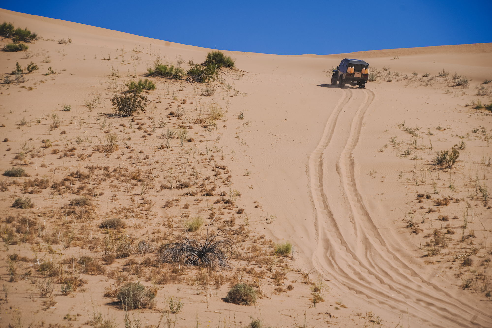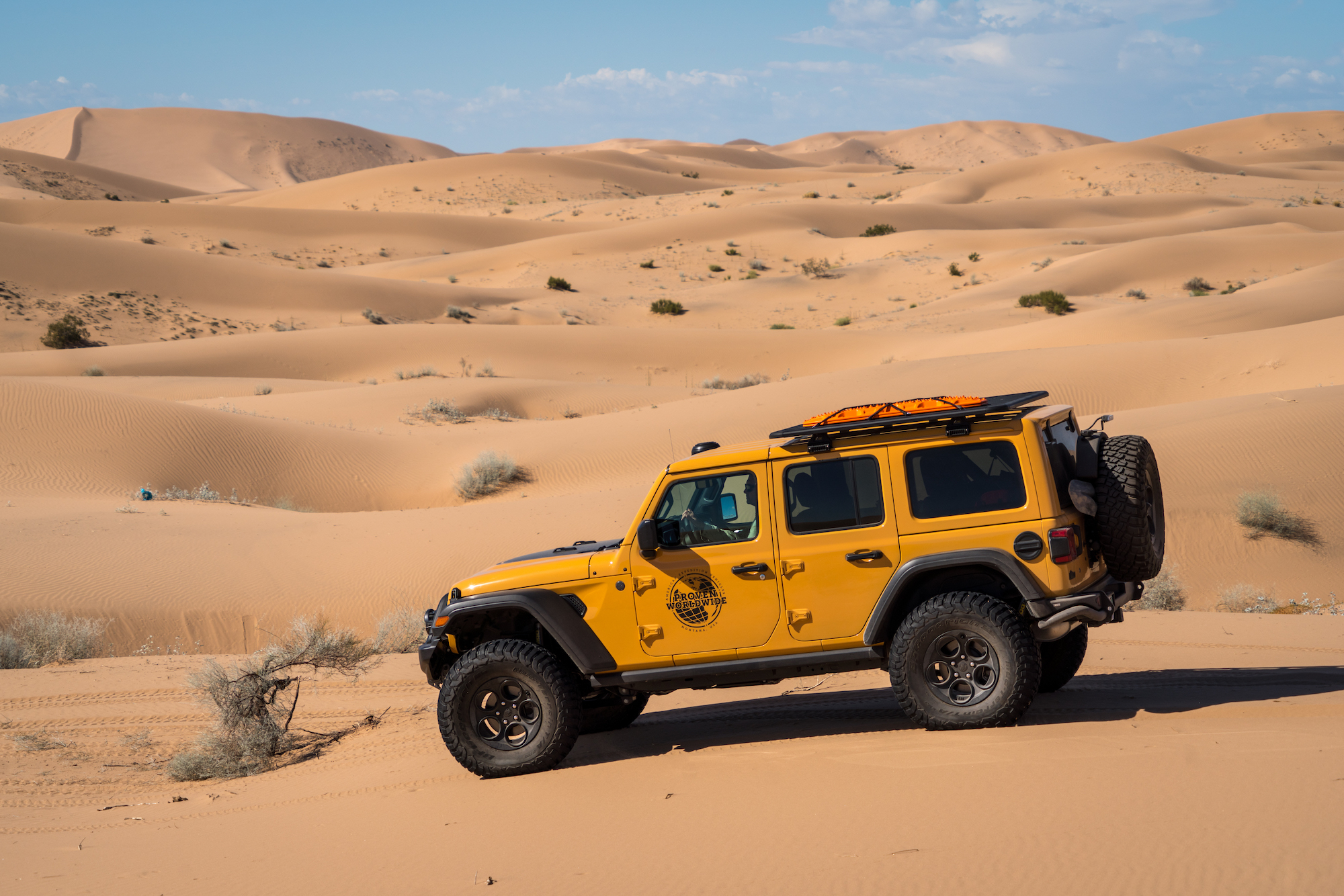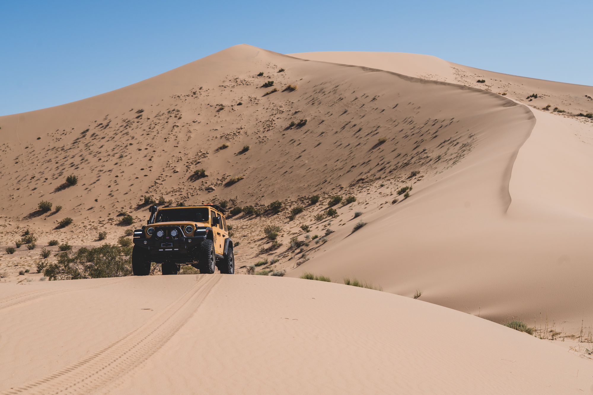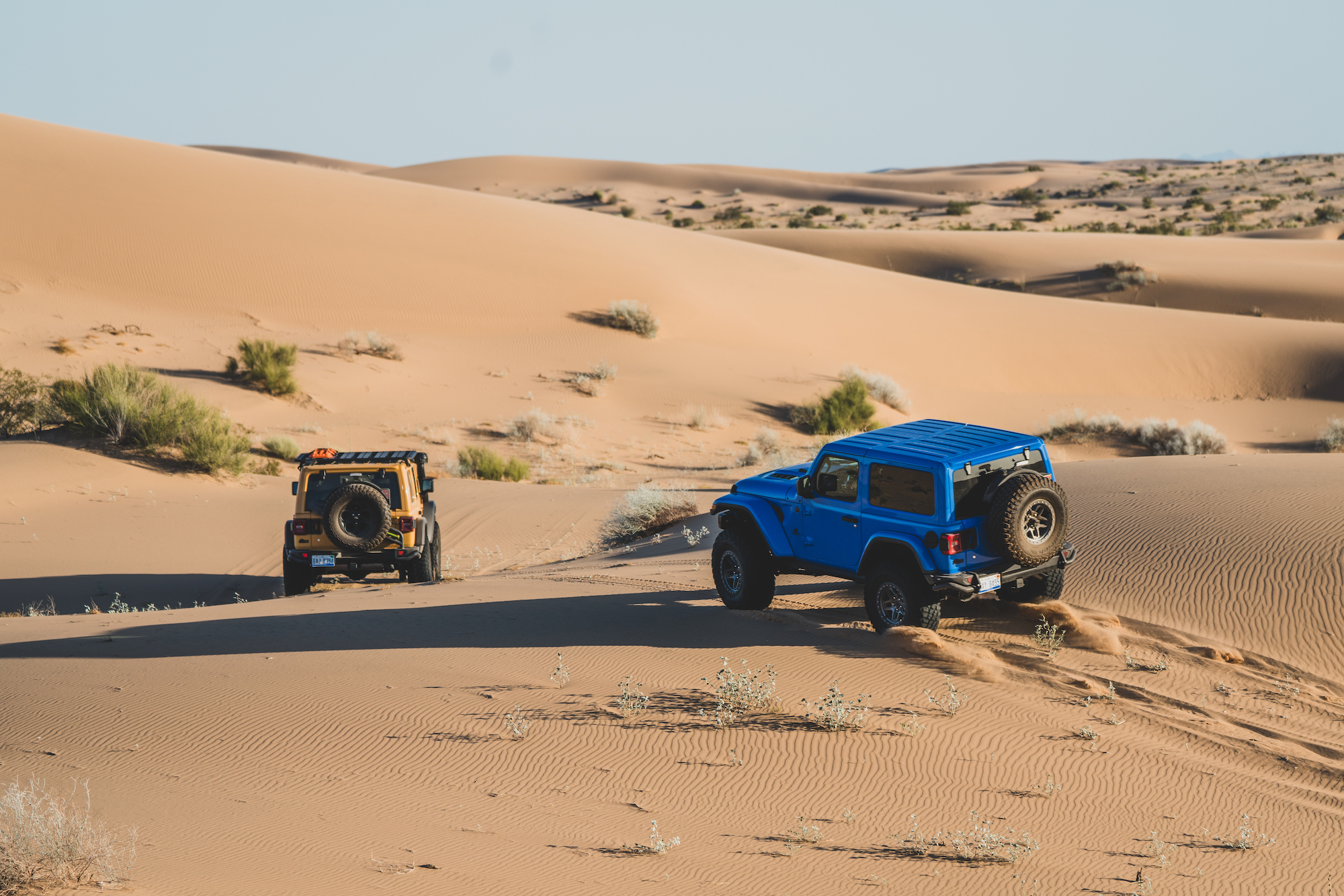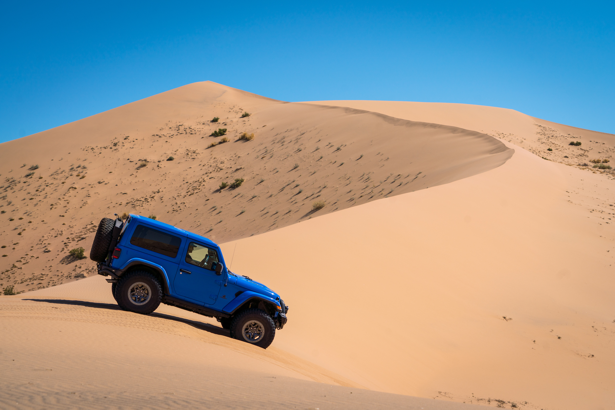 The Hemi barked to life, squatting the rear of the Wrangler, accelerating us up the face of the dune. Dave did his best to navigate the aggressive camber of the slip face and the large bush that blocked the cleanest line to the top. The transmission hesitated, downshifting too late and causing the tires to break free from the available flotation. Instead of accelerating more, Dave backed off the throttle and came to a controlled stop. Even with 37-inch tires and a 400-horsepower V8, the soft silica was too much, and a different tack was required. Backing down would have been difficult, and the Jeep was already listing heavily to the driver’s side. It is moments like this where someone’s true experience shows through, the 10,000 hours that come to a practitioner of their craft. Gently, Dave rolled the vehicle rearward ever so slightly, bringing the tires to the rear lip of the small hole dug when the tires spun. He used that position to restart the climb, and we progressed another foot higher. Again, he backed off before the vehicle was grounded to the frame, and another attempt was made—the perfect balance of momentum and acceleration moving us forward a few feet. With one rock of the throttle, the Wrangler hooked up, and we started building momentum to the top, to the cheers of our teammates on the crest.