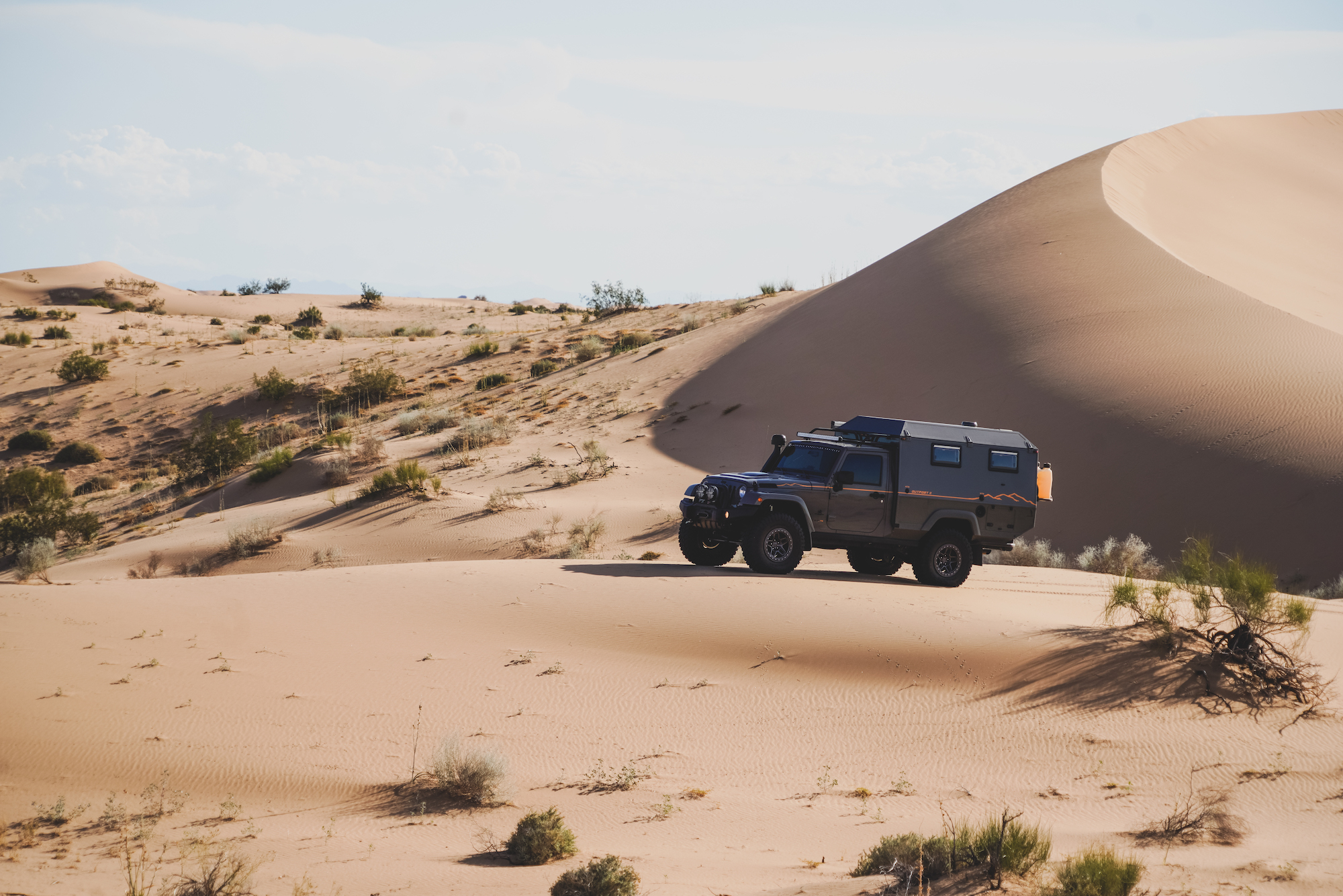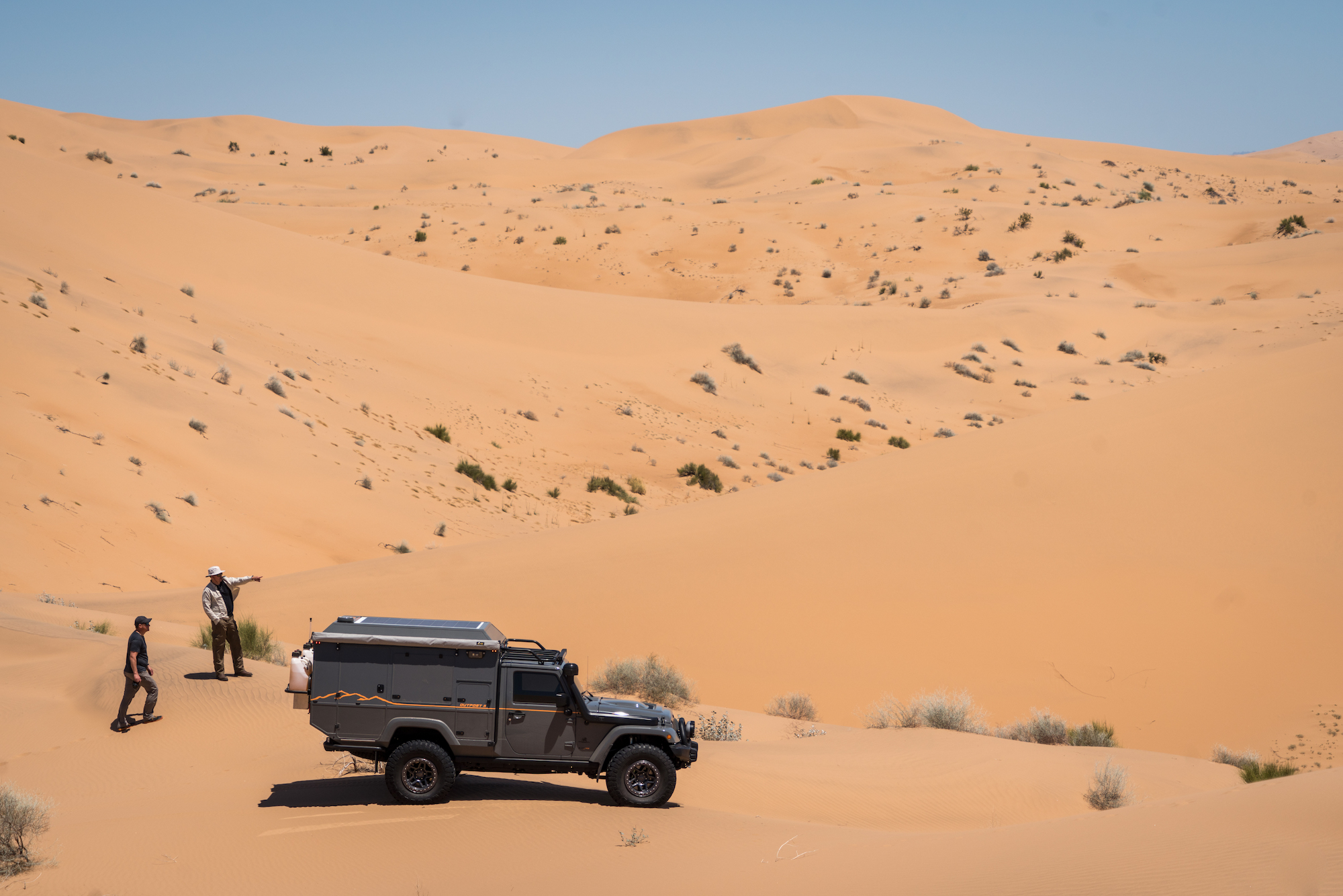 The other surprise from the trip was taking a self-contained camper along for the crossing, the Outpost II. This machine is the brainchild of Dave Harriton, CEO and head designer for AEV. Dave is a longtime friend, and he wanted to see if a “house” on wheels could make the crossing. In the end, what made the Outpost work was the attention to detail, from the use of lightweight composites and minimalist design to the fitment of a 5.7-liter Hemi and 37-inch tires to help propel the camper through the dunes. Dave slept in total comfort, sealed off from the blowing sands.