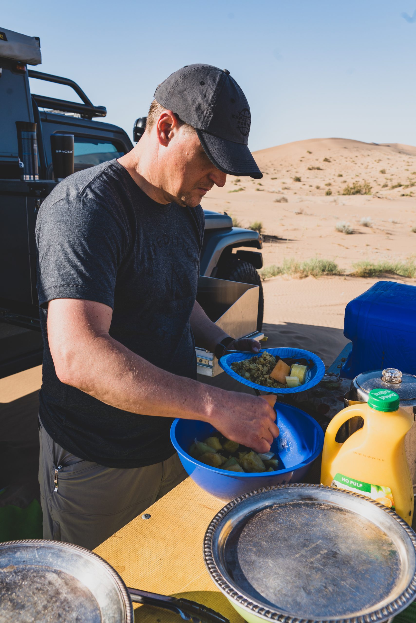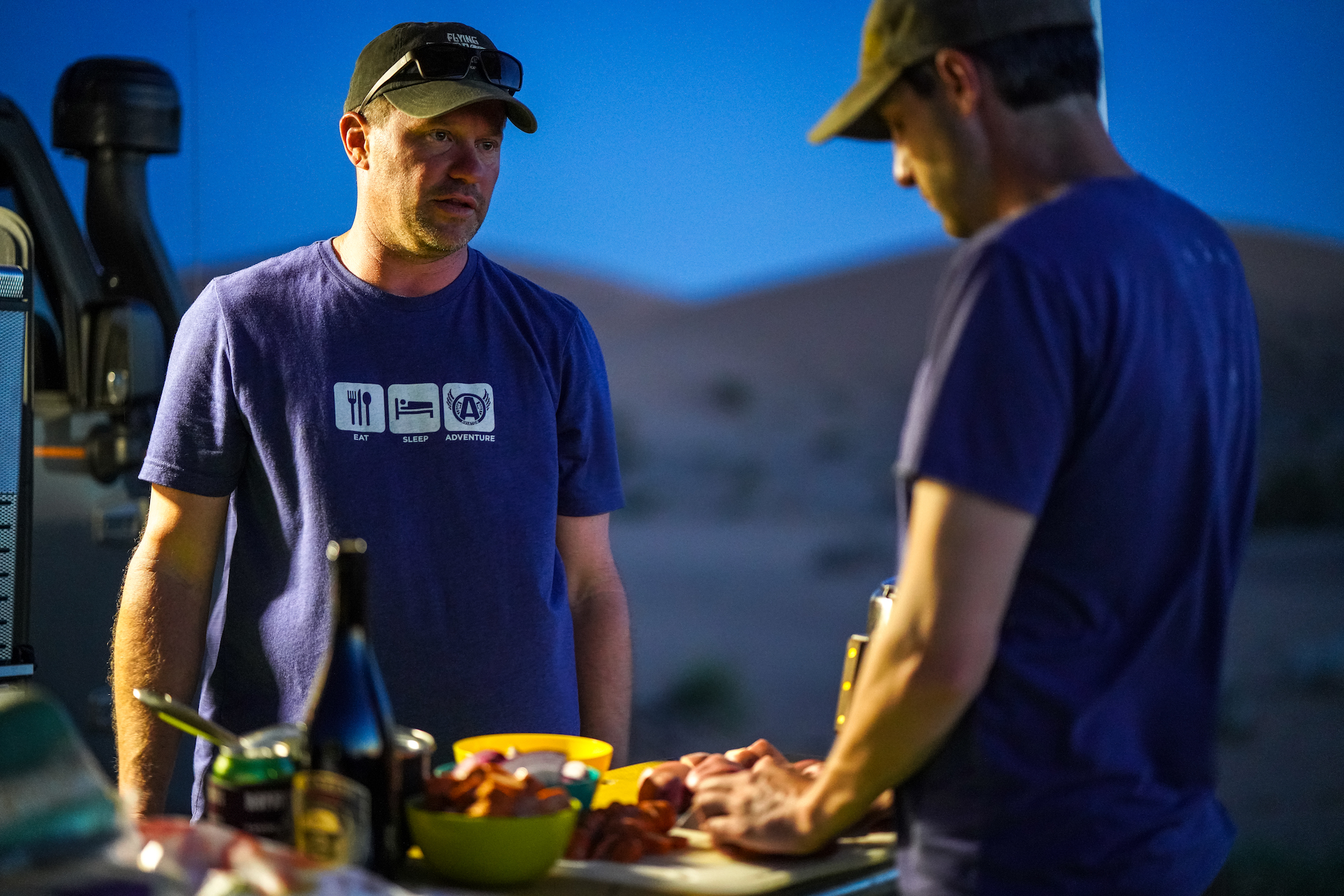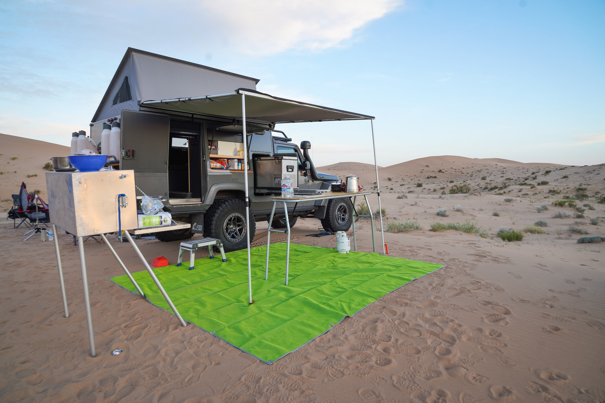 There were a few other pieces of kit that worked like a charm, including the mess kitchen that Dave brought along. It is designed for whitewater rafting trips, so it was extremely robust and also collapsible. The entire unit was constructed primarily from aluminum and is well sealed from both water and dust. This made for a perfect gathering place at the end of the night and early morning to prepare meals and clean dishes. Dave would set it up next to the Outpost, which had a National Luna fridge on an exterior slideout—ice cream for everyone. He also used a semi-porous drop cloth to keep the entire area relatively clean and organized. I still remember how good the pancakes and bacon tasted deep in the Sonoran Desert