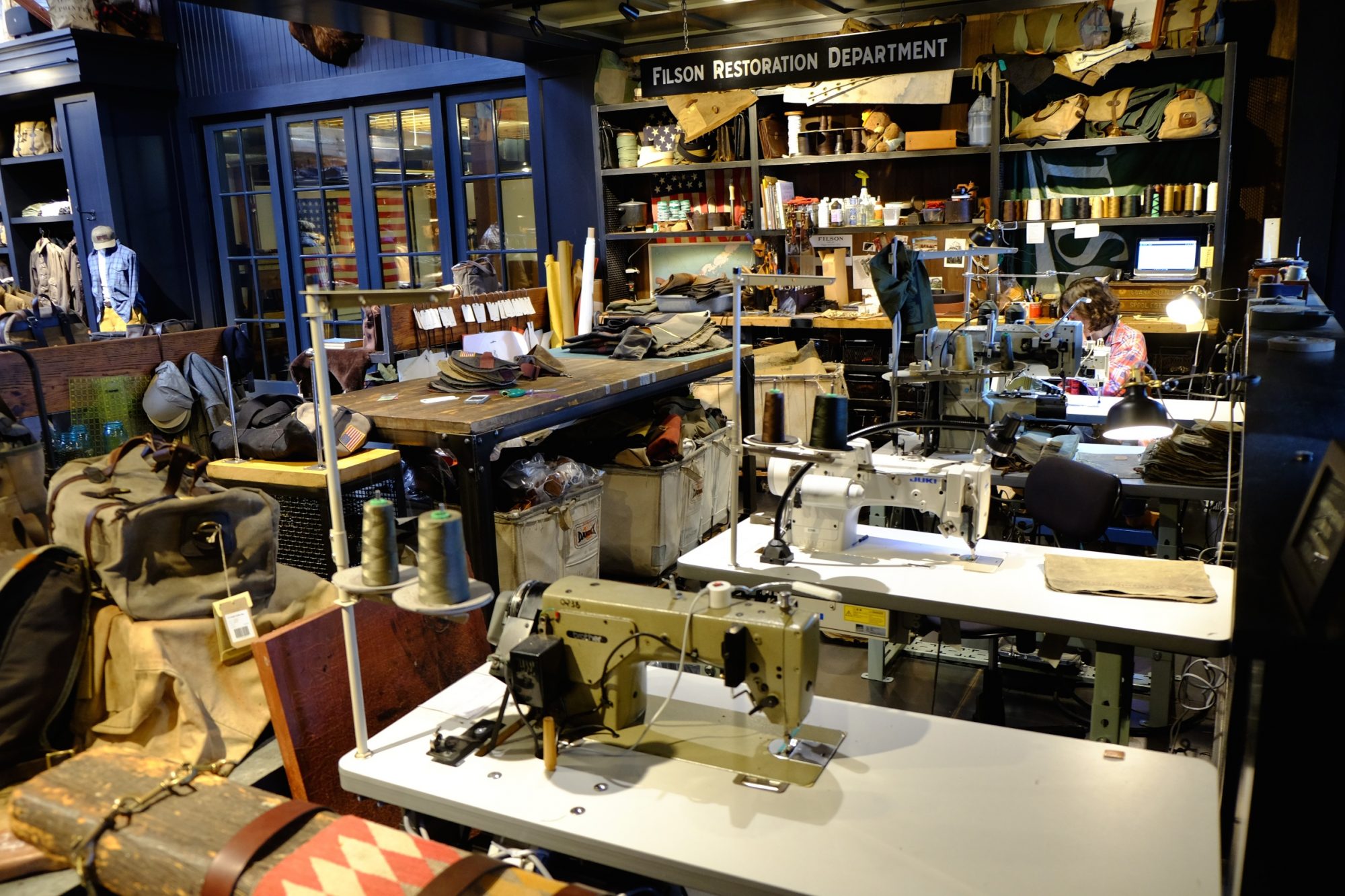 On the first floor of the new Filson building sits a sprawling manufacturing complex, filled with thumping sewing machines and dozens of skilled sewers swiftly but carefully joining stiff canvas to richly tanned leathers. At the back of the room designers tugged and pulled at samples and plotted out the creations for the coming season. The entire facility is abuzz with activity proving the Filson brand still does a brisk business.