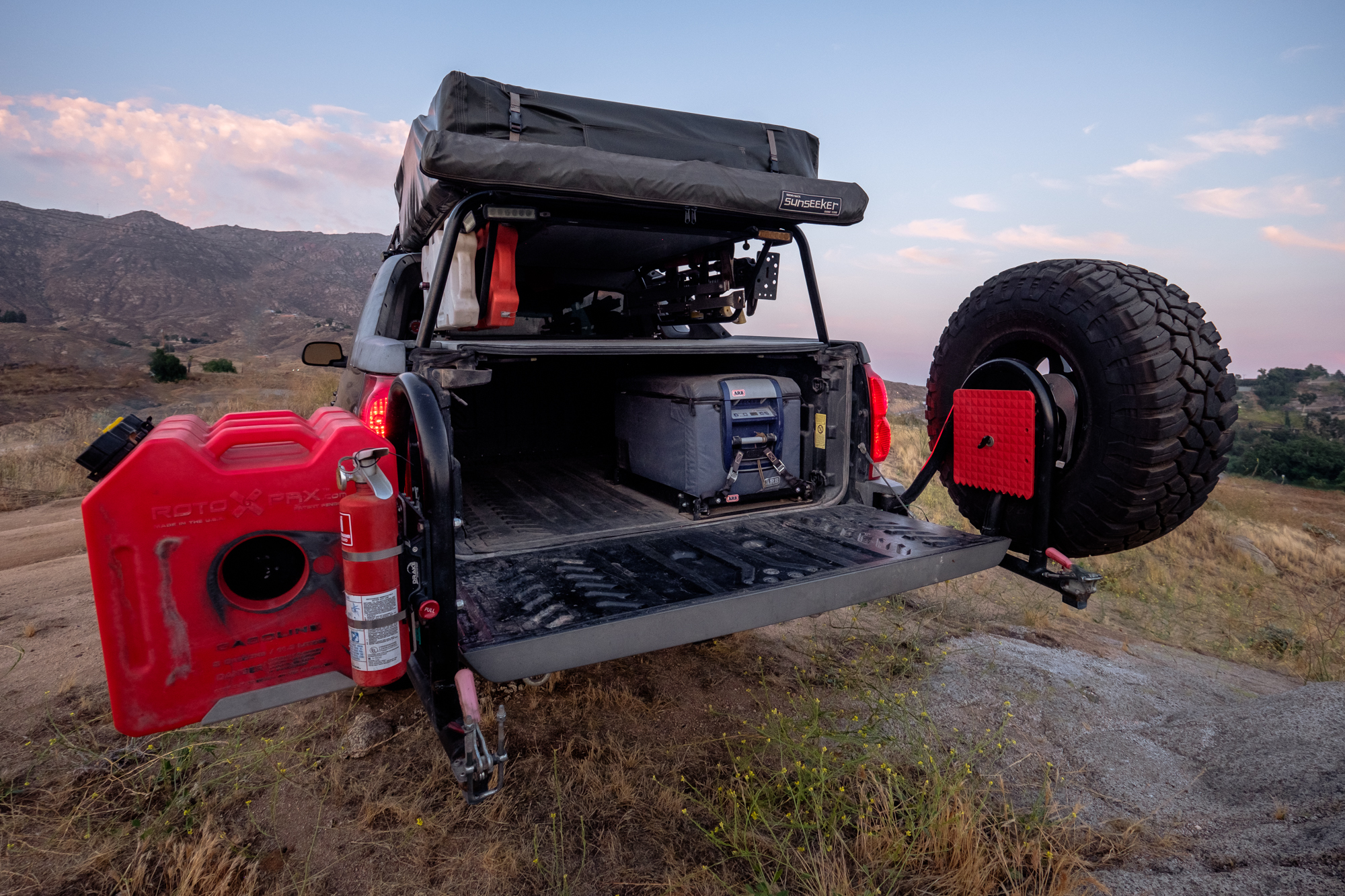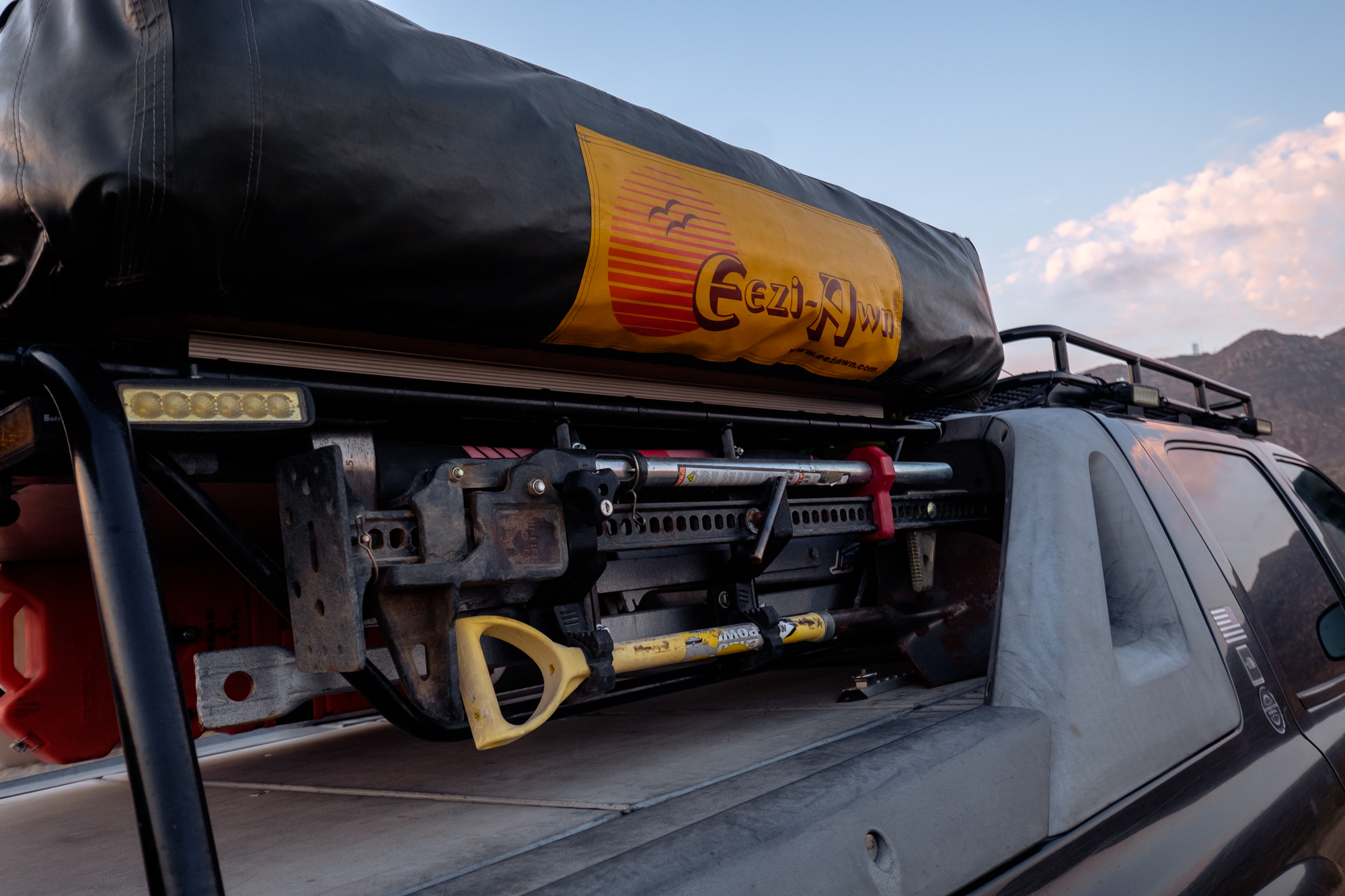 The bed of the Avalanche is even more impressive, though. It carries a custom welded overhead rack with an Eezi-Awn Xklusiv 1400 rooftop tent that has survived storms that ripped neighboring tents to shreds. Bolted to the back is a Rhino-Rack Sunseeker Dome awning that provides the perfect amount of shade over the tailgate on hot days, and a Front Runner Outfitters camp table tucks neatly under the rack. A Hi-Lift Extreme, 11,000-pound PullPal, and Rotopax are mounted down the exterior rails, and it’s worth noting that between the hard-mounted fuel tank and Rotopax this truck carries a total capacity of 46 gallons. Not bad at all.