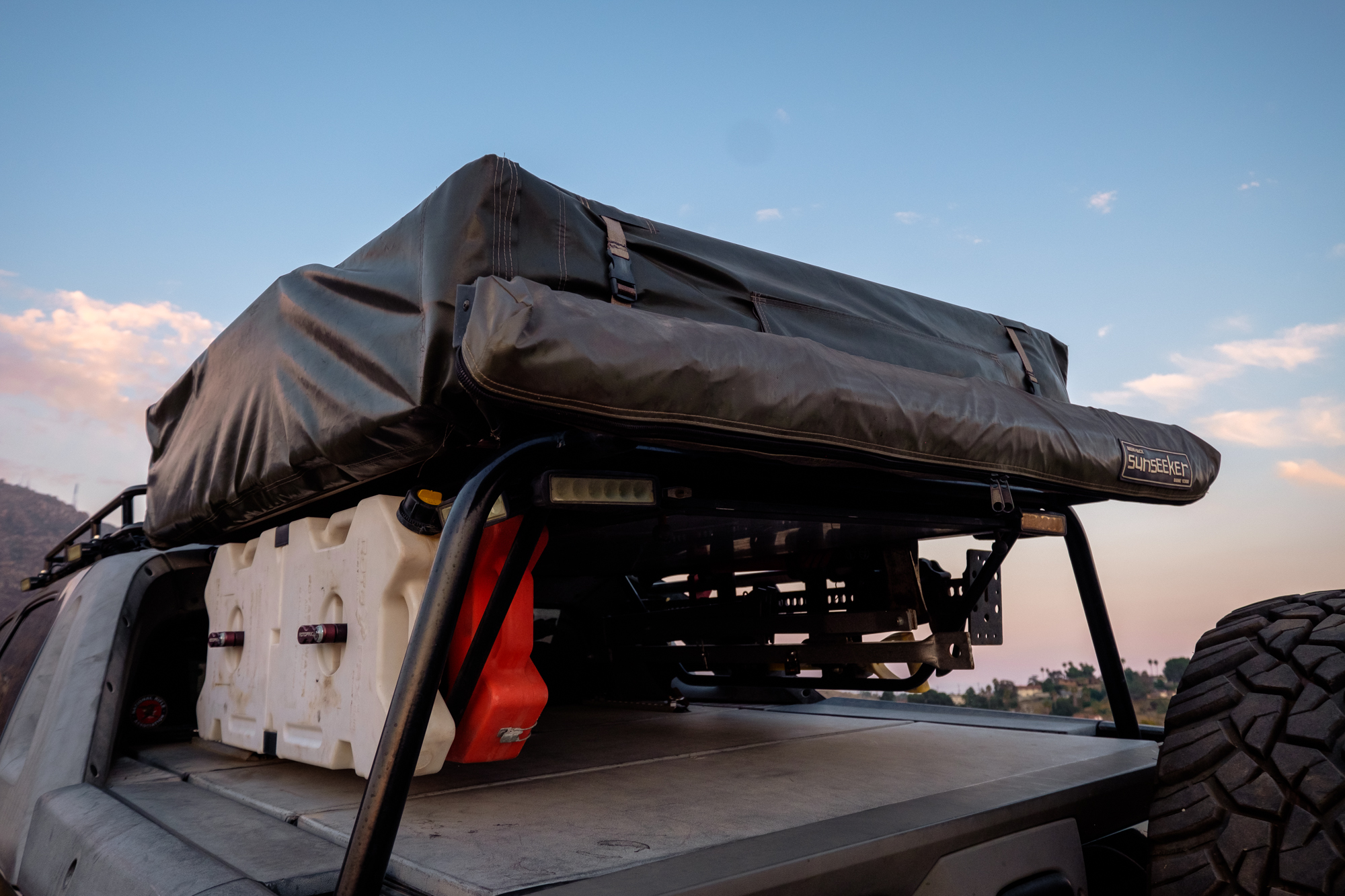 The overhead bed system then ties into the roof rack, which was custom-built based on the feedback from Overland Journal’s roof rack test, combining the best aspects of the ARB and Gobi racks. This rack has a cutout for the sunroof, as well as Microtune LED lights for dune and off-road driving, and ambient campsite lighting on all sides and rear.