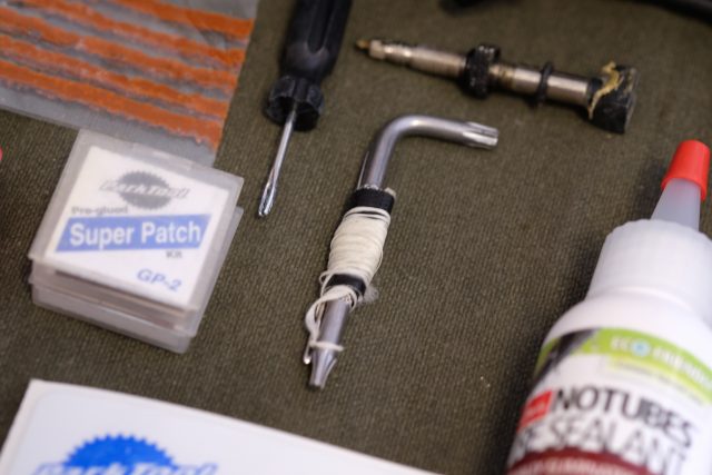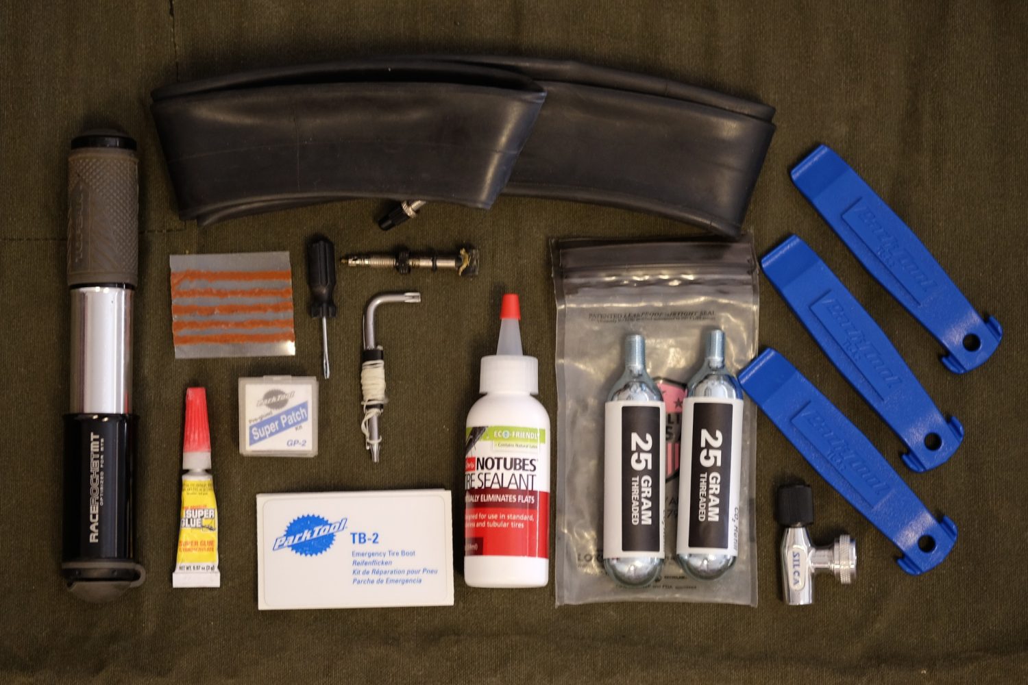 The most common trailside repair is the flat tire. Whether you use tubes or have followed the rapid trend toward tubeless systems, retaining air remains a troublesome pursuit. My flat-fixing kit has ballooned over the years in response to the many new methods available to repair a damaged tire. Comprehensive as it is, it isn’t too heavy nor does it take up too much space.