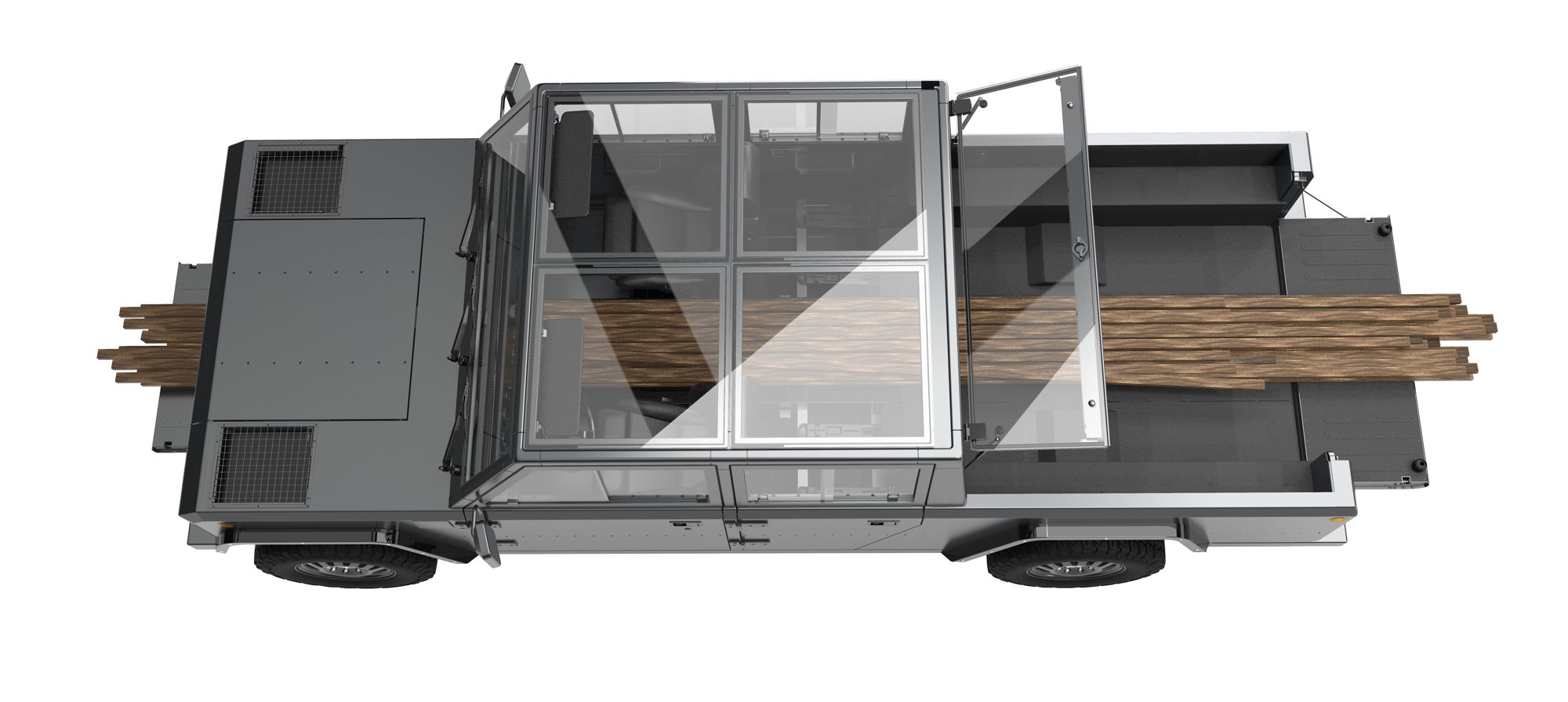 Now a truck that can’t haul anything isn’t very useful, so the first thing we did was check the payload. As it turns out, Bollinger did pretty darn well. The B2’s bed is 4’1” wide by 5’9” long, and the internal cab can be opened to haul up to 72 full sheets of 4 x 8-foot plywood. I can’t imagine how they fit that many into the vehicle, but that’s what they say. The rear glass can also open, allowing you to store things out of the roof of the vehicle if needed.